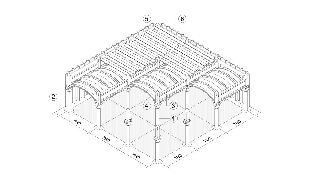 Il modulo Moretti Modular Contractor cantina 7×7 è un sistema di copertura con volta a botte secondo una maglia quadrata 7 metri. La struttura di sostegno è appoggiata su pilastri tondi aventi diametro di 60 centimetri, che possono avere altezza variabile fino a 6,00 metri, completi di capitello per l’appoggio delle travi con intradosso ad arco ed estradosso piano che sostengono la volta. Nella sezione dei pilastri e nei capitelli il modulo presenta una cavità entro la quale trovano possono trovare collocazione tutte le esigenze impiantistiche necessarie, ad esempio l’impianto di illuminazione, di climatizzazione o anche il sistema di umidificazione per nebulizzazione.