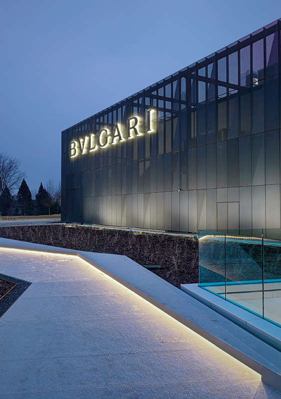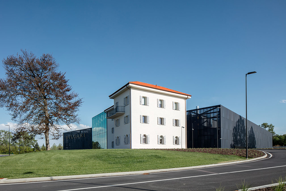 Collocata nel distretto orafo di Valenza, la nuova sede di Bulgari si sviluppa su una superficie di 15.000 mq ed è composta da due edifici dai caratteri architettonici differenti, che creano un ponte ideale tra innovazione e tradizione. L’anima legata alla tradizione si esprime nella valorizzazione di un edificio pre-esistente, la Cascina dell’Orefice, costruita nel 1860 e considerata il primo laboratorio orafo di Valenza. L’edificio, ricostruito e ampliato grazie ad una struttura interamente in vetro che riprende in chiave contemporanea la sagoma originale della Cascina, si sviluppa su 1.200 mq, è alto 13 m e presenta spazi istituzionali e di accoglienza. Il secondo complesso, che ospita la Manifattura, coniuga la capacità produttiva altamente tecnologica con un design in linea con i valori stilistici del brand.