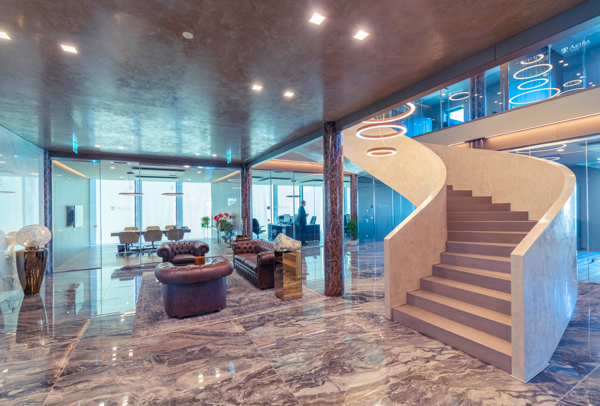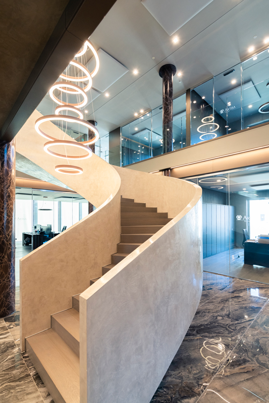 L’elemento caratterizzante e peculiare di questa realizzazione è costituito dalla torre a cinque livelli completamente vetrata posta sull’ angolo frontale di ciascuno dei due edifici: una struttura cubica in acciaio e legno lamellare progettata e realizzata con grande perizia con sbalzi da 7 metri appesi alla trave di copertura.