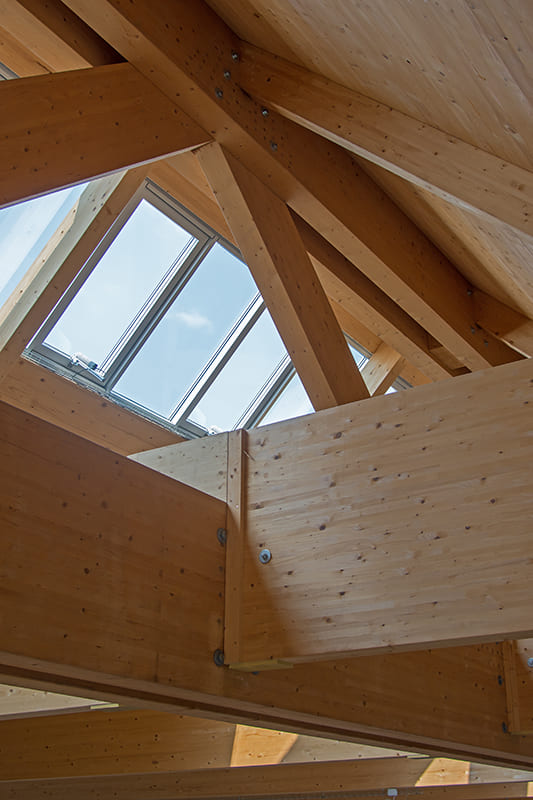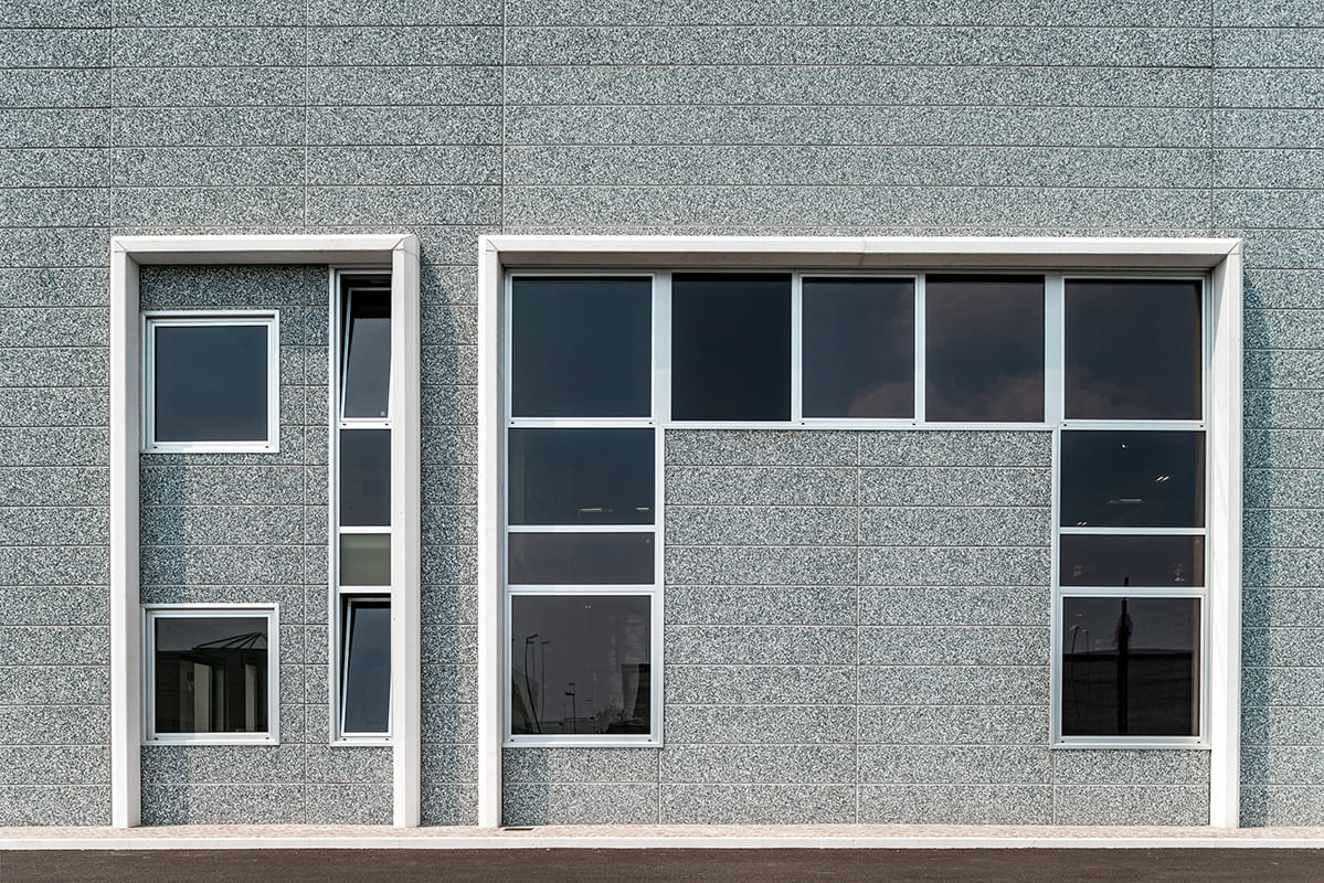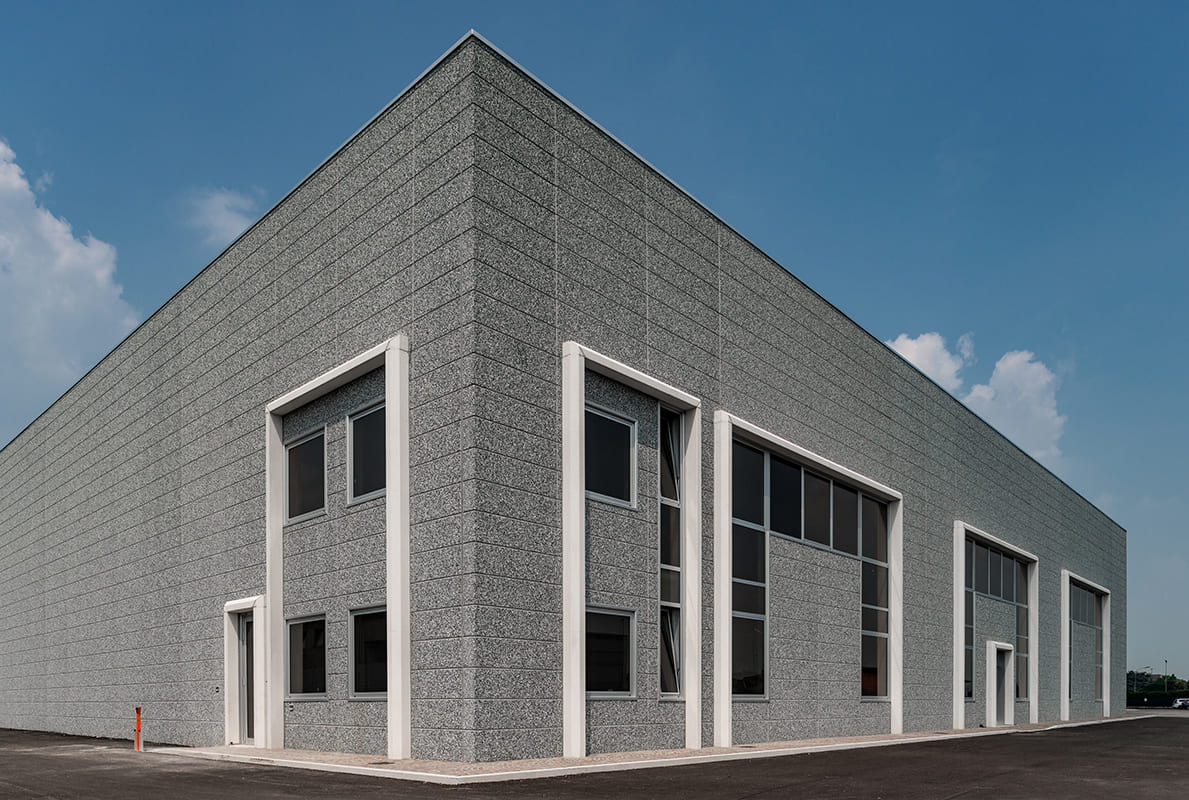 L’edificio si caratterizza per le numerose scelte altamente performanti sotto il profilo dell’isolamento termico e dell’ecosostenibilità. Sul perimetro sono stati montati pannelli prefabbricati di tamponamento a sviluppo verticale con finitura esterna in spaccato di marmo Verde Alpi con falsi giunti orizzontali; realizzati con la tecnologia “sandwich” a taglio termico, hanno spessore di 30 cm ed una trasmittanza termica media pari a 0,22 W/mqK. Il pacchetto termoisolante in copertura sopra i pannelli Xlam è costituito da una barriera al vapore, doppio pannello in lana di roccia ad alta densità con relativi listelli distanziatori, pannello in OSB, manto impermeabile in TPO, telo in TNT e strato finale zavorra in ghiaia di pomice naturale. Sulle falde inclinate che formano gli shed sono installati pannelli fotovoltaici per una potenza finale di circa 250 Kw e su una zona della parte piana con pomice è stata collocata una struttura metallica a piastra per l’alloggiamento di tutti gli impianti.