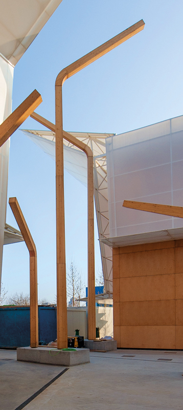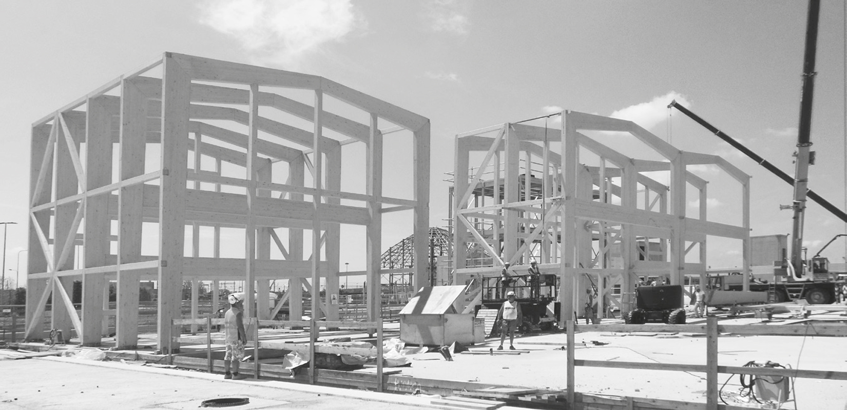 Gli edifici in legno erano progettati con un sistema modulare. La struttura portante di ogni edificio era completamente in legno lamellare, con un’area coperta totale di circa 1900 mq. Ogni fabbricato si sviluppava su due livelli, segnati da solai in legno lamellare con pannelli di copertura intelaiati, completamente realizzati e finiti in stabilimento. I tamponamenti verticali erano realizzati con struttura sandwich: un pannello isolante in polistirene rivestito sui due lati da pannelli di legno.