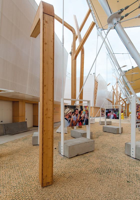 A distinguere tra loro gli edifici, strutturalmente tra loro uguali, erano la forma e i materiali con cui erano rivestite le facciate. Il Cluster Riso era rivestito con Alucobond®, alluminio riflettente che specchiava il paesaggio circostante scenograficamente organizzato come una risaia, con percorsi che si diramano tra specchi d’acqua e piantagioni di riso. L’impianto degli edifici era compatto e lineare, così da ricordare nella sua regolarità la geometria delle risaie. Il Cluster Cacao si caratterizzava per una disposizione planimetrica più casuale, come compete alle piantagioni di cacao, con all’interno anfiteatri. Lo stesso linguaggio architettonico si leggeva sull’articolazione delle facciate: pannelli verticali di betulla si sovrapponevano a strutture in acciaio verniciate in bianco a sbalzo, rivestite con tessuti tipici dell’ambiente nautico, creando un effetto fra l’opaco e il translucido per permettere un dialogo fra la struttura e le sue coperture.