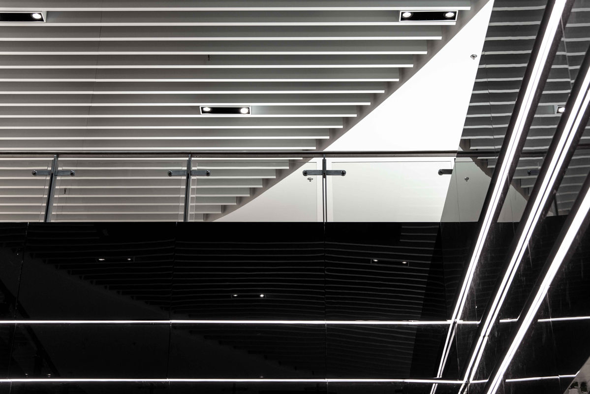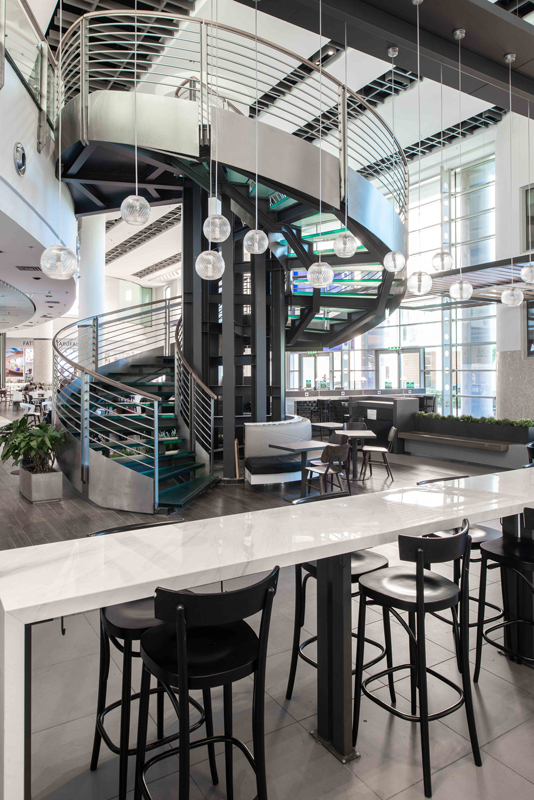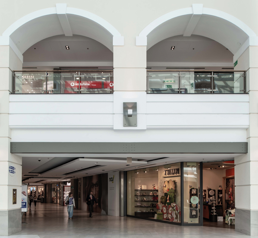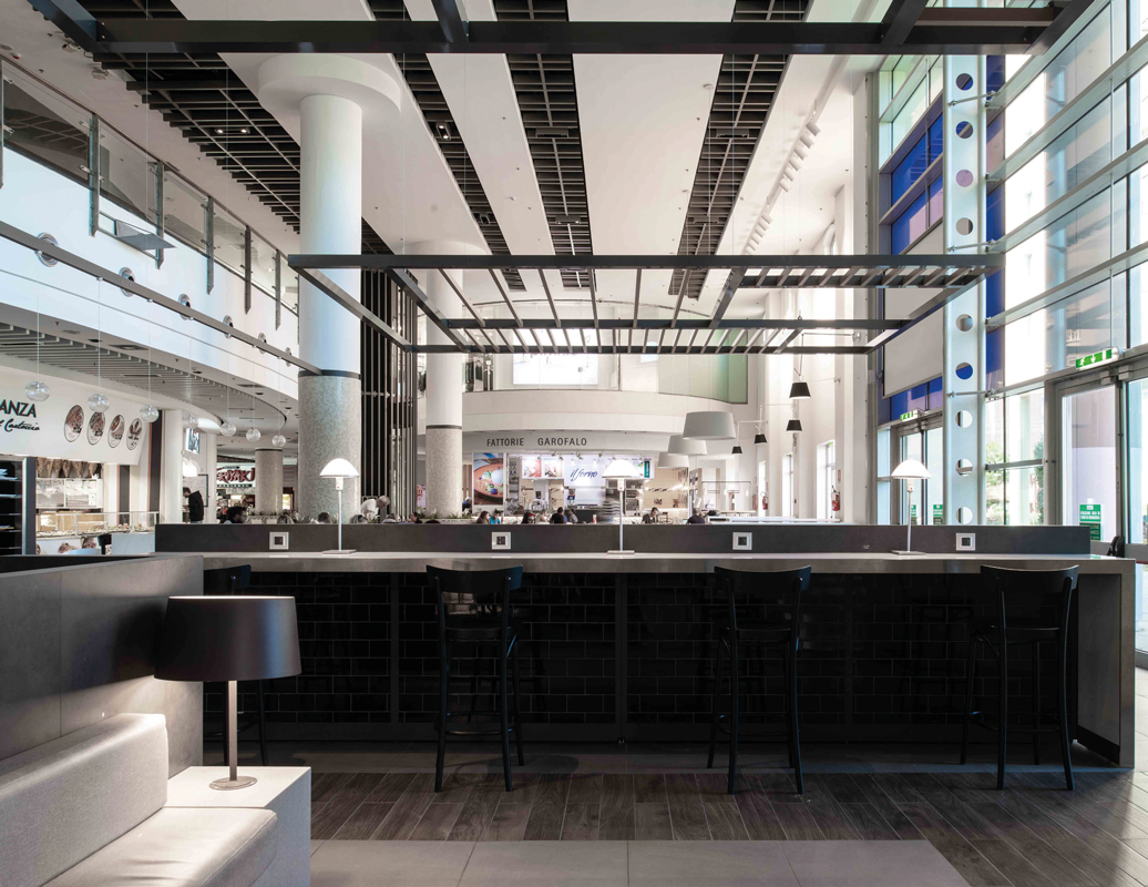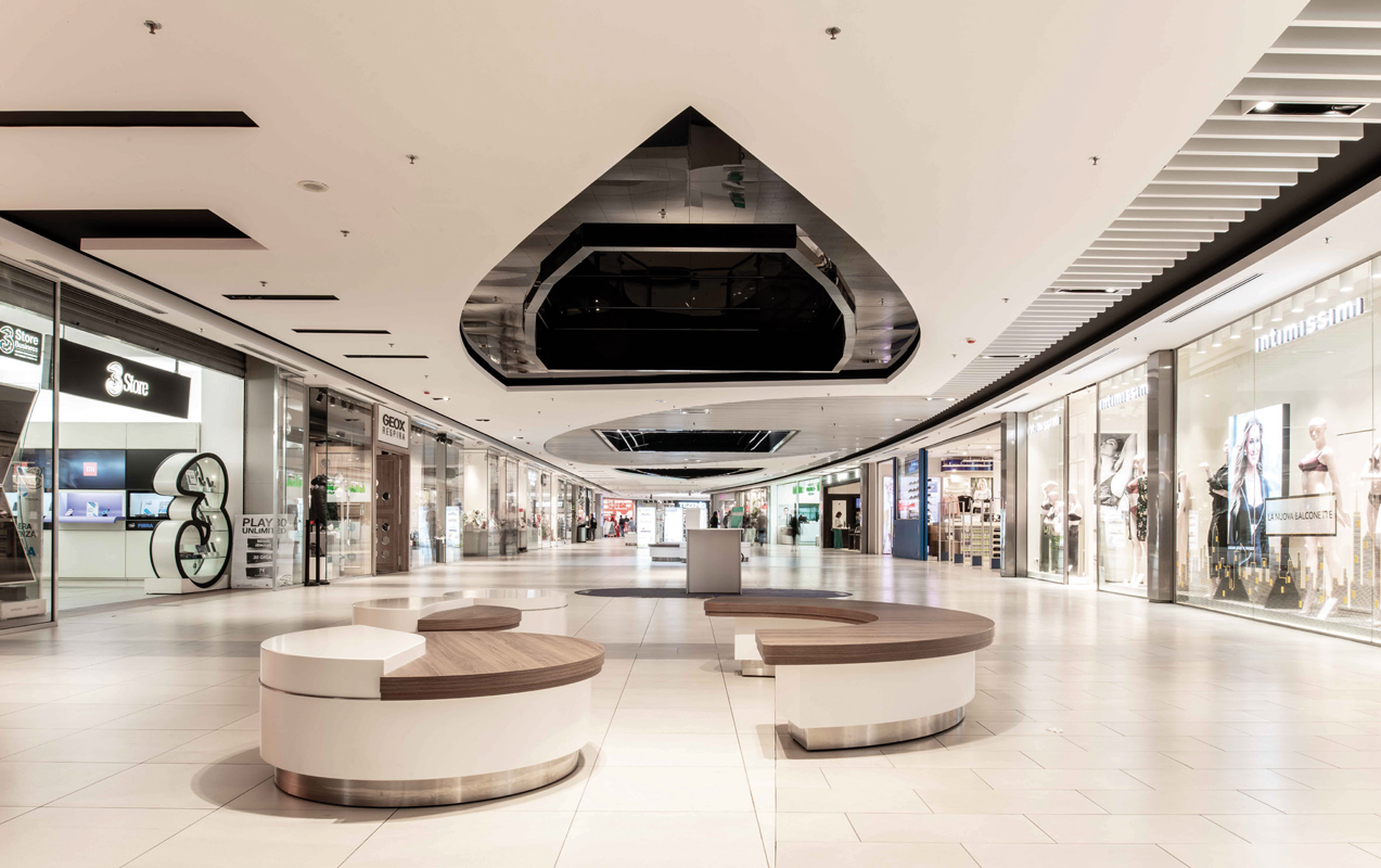 Dal punto di vista architettonico, il progetto di rinnovamento ha richiesto la realizzazione di nuovi controsoffitti con geometrie, colori e materiali contemporanei, la posa di una nuova pavimentazione, la ritinteggiatura delle pareti interne con nuances pastello e il rifacimento complessivo dell’area food, con la creazione di spazi più accoglienti, la creazione di una nuova scala per l’accesso al piano superiore e il rivestimento dei pilastri e dell’ascensore a vista. Inoltre, sono stati completamente rinnovati i bagni, intervenendo sia sul fronte degli arredi che dell’impiantistica e delle finiture. Non da ultimo, è stato avanzato il fronte delle vetrine, ampliando così il loro spazio espositivo. Nuovi arredi, che uniscono stile contemporaneo a elevata resistenza, sono stati inseriti in tutte le aree a maggior afflusso del Centro. Anche la hall di ingresso del multicinema è stata oggetto di un profondo restyling.