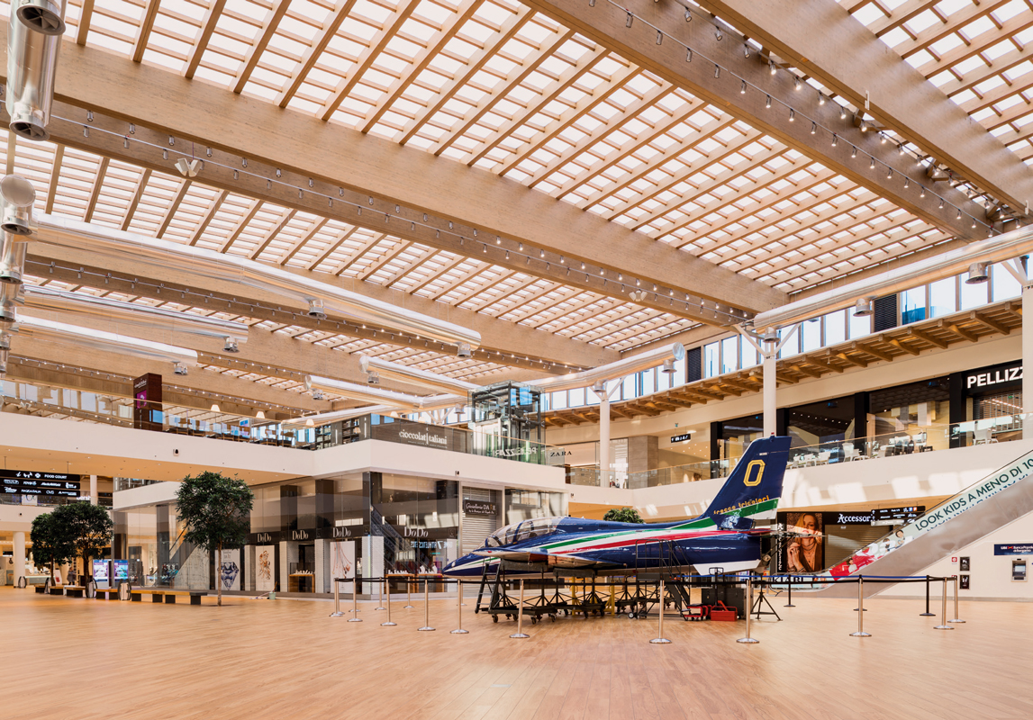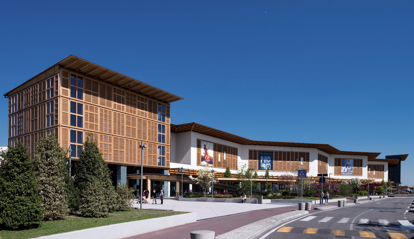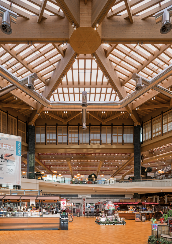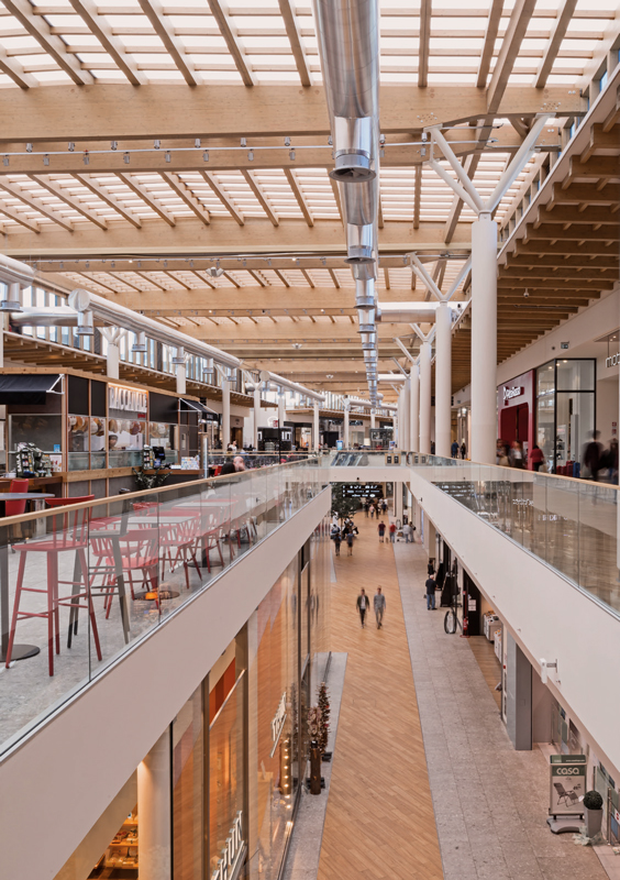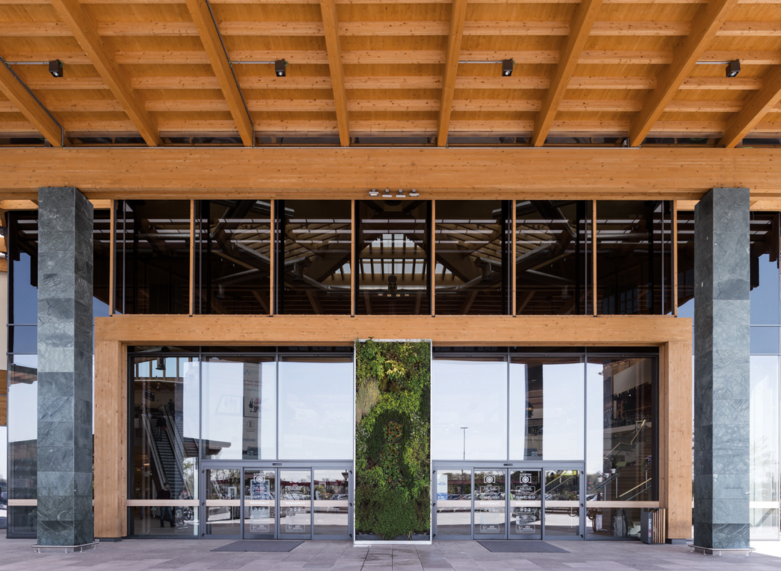 Per le dimensioni straordinarie del mall, Moretti Modular Contractor ha prodotto e installato un impalcato complessivo di circa 100 mila mq con ben 12 mila mq circa di tamponamenti in legno, di provenienza certificata Green Building Council. Il legno è stato utilizzato anche per i solai, le pensiline e le coperture. Per quest’ultime sono state adottate soluzioni assolutamente innovative, così da garantire oltre 650 m lineari tra il primo e l’ultimo pilastro del mall. La soluzione applicata è tra le più grandi coperture in “glulam beams”, legno lamellare strutturale da fonti sostenibili, mai realizzate in Europa. In particolare la galleria più ampia ha un’orditura principale di 27 coppie di travi a doppia pendenza, con luce massima di 40 m, che poggiano su pilastri tondi misti di calcestruzzo e acciaio. Sui fianchi e in copertura sono stati utilizzati pannelli di legno con travetti prefabbricati in stabilimento. Tutta la struttura è realizzata secondo le norme tecniche più recenti in materia antisismica, con giunti shock-transmitter che collegano tra loro le otto porzioni dell’edificio.
