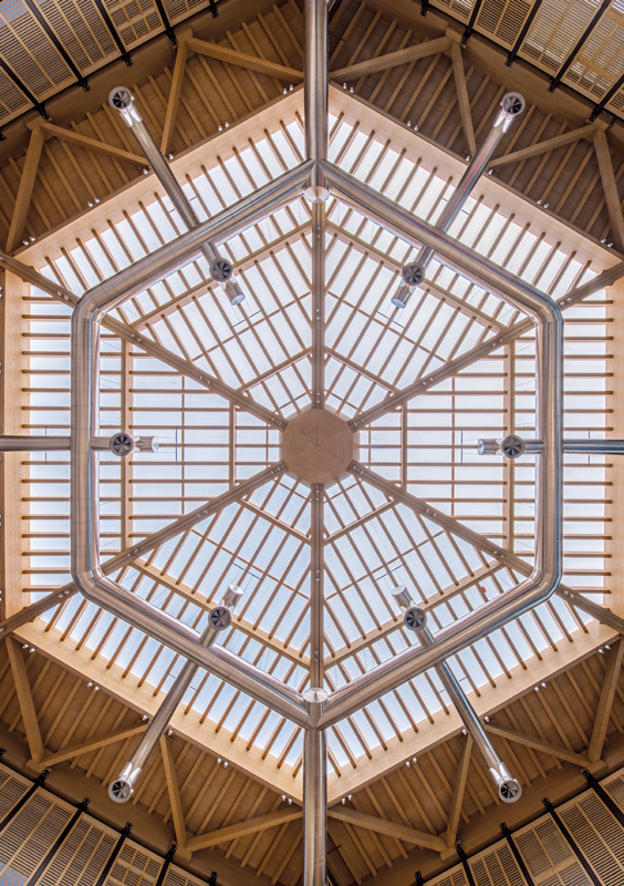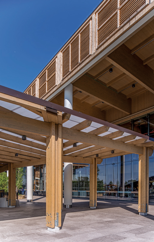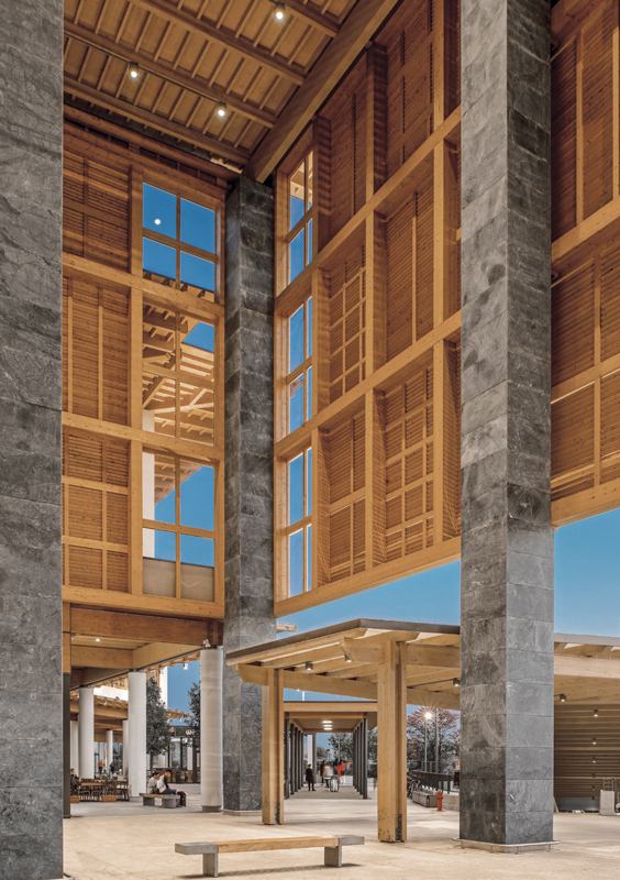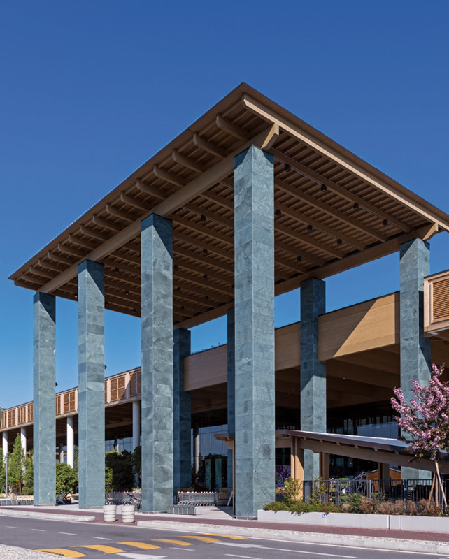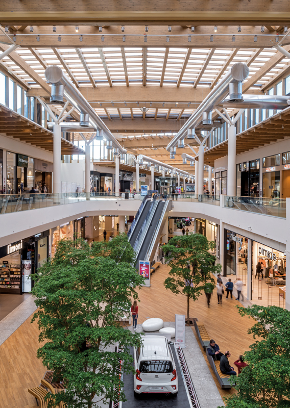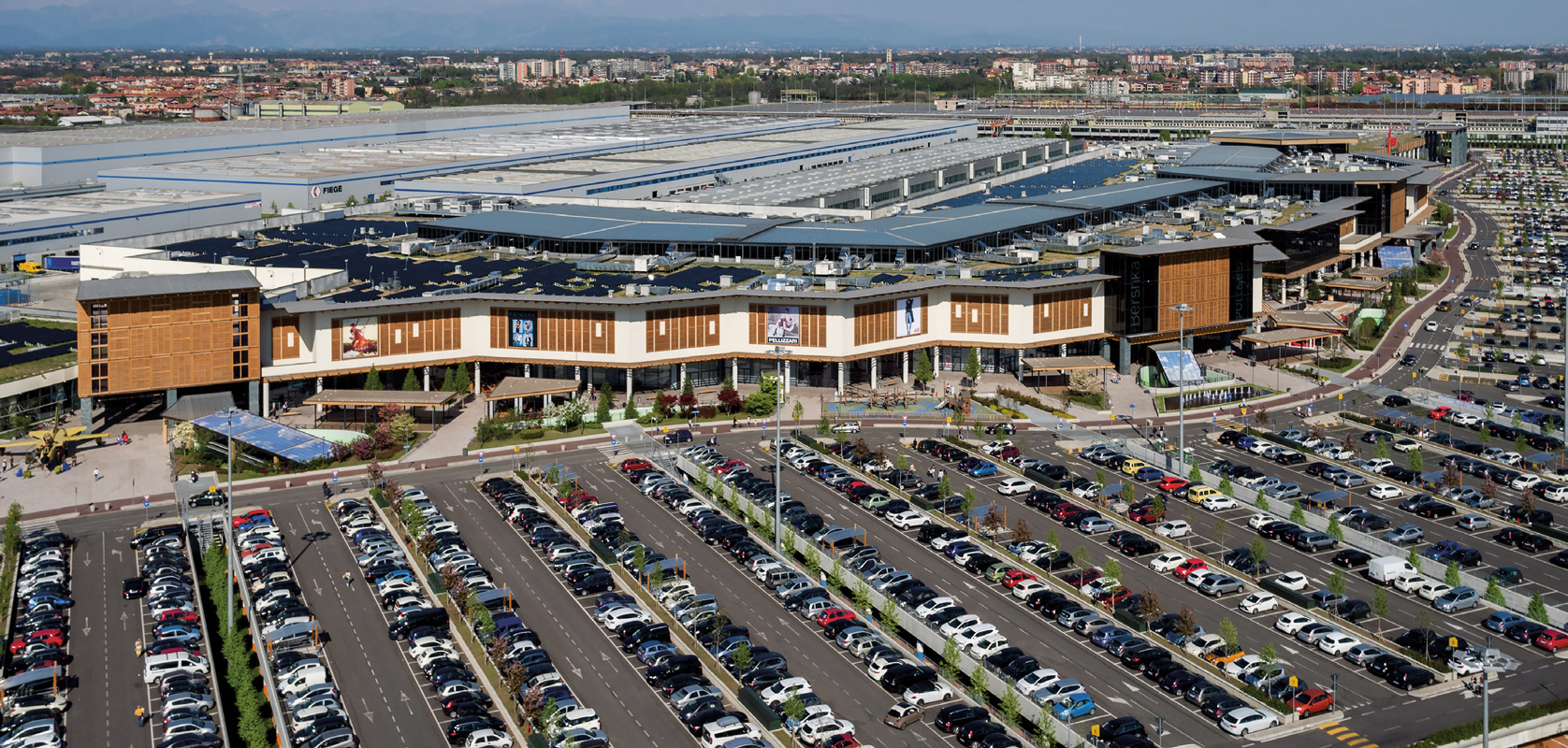 Per le dimensioni straordinarie del mall, Moretti Modular Contractor ha prodotto e installato un impalcato complessivo di circa 100 mila mq con ben 12 mila mq circa di tamponamenti in legno, di provenienza certificata Green Building Council. Il legno è stato utilizzato anche per i solai, le pensiline e le coperture. Per quest’ultime sono state adottate soluzioni assolutamente innovative, così da garantire oltre 650 m lineari tra il primo e l’ultimo pilastro del mall. La soluzione applicata è tra le più grandi coperture in “glulam beams”, legno lamellare strutturale da fonti sostenibili, mai realizzate in Europa. In particolare la galleria più ampia ha un’orditura principale di 27 coppie di travi a doppia pendenza, con luce massima di 40 m, che poggiano su pilastri tondi misti di calcestruzzo e acciaio. Sui fianchi e in copertura sono stati utilizzati pannelli di legno con travetti prefabbricati in stabilimento. Tutta la struttura è realizzata secondo le norme tecniche più recenti in materia antisismica, con giunti shock-transmitter che collegano tra loro le otto porzioni dell’edificio.