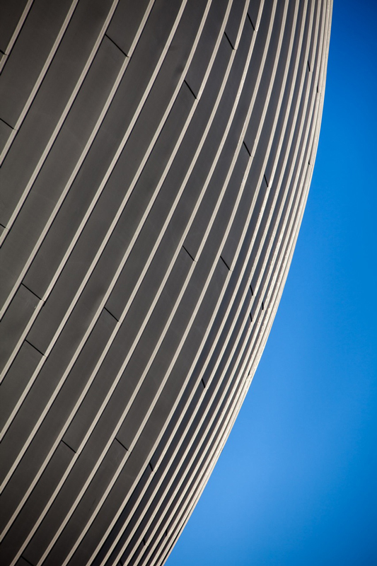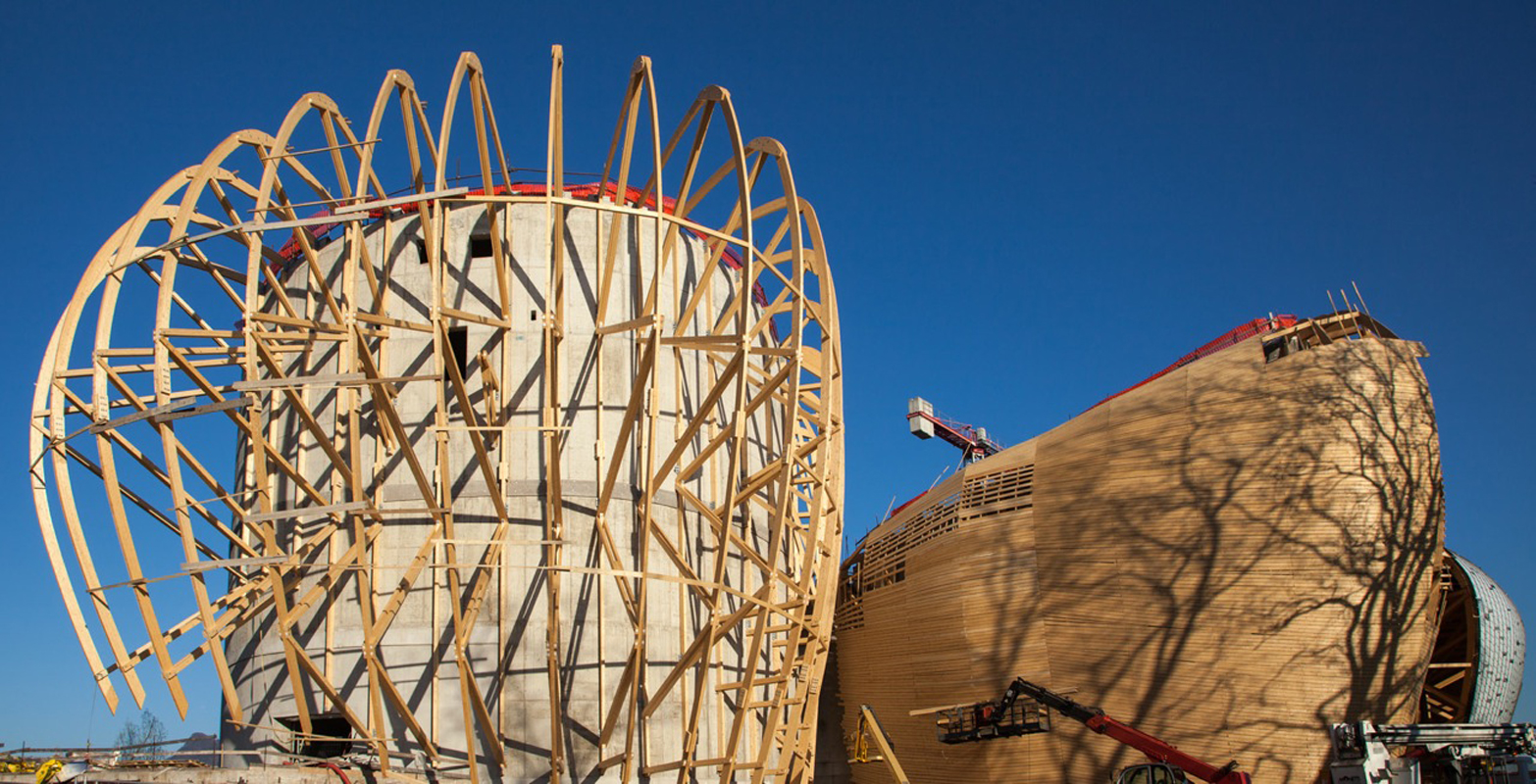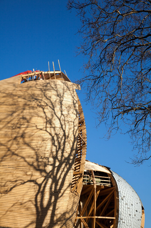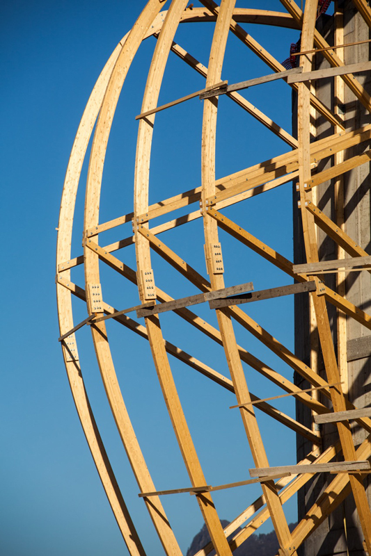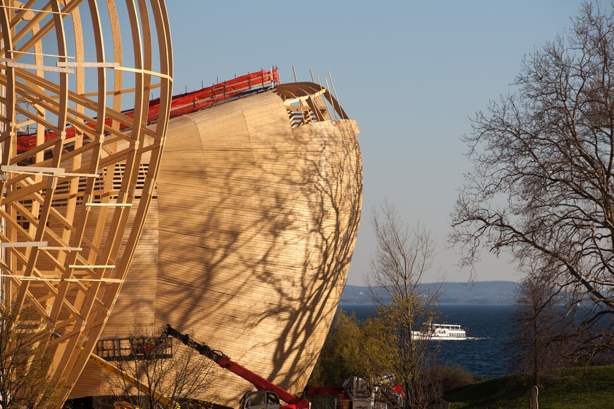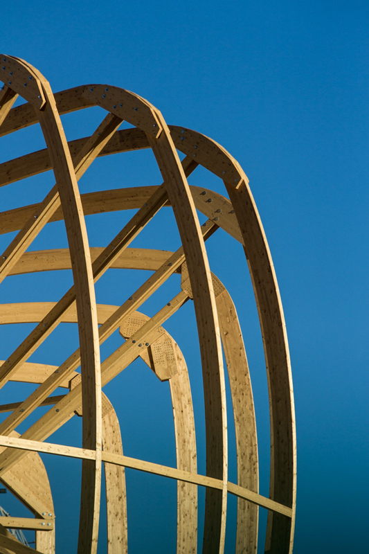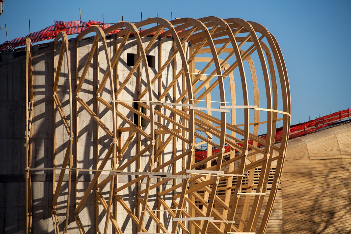 La complessità determinata dalla forma degli edifici che compongono l’opera è stata risolta attraverso un fitto reticolo di travi in legno lamellare, ciascuna delle quali presenta disegno e lunghezza differenti, con uno sviluppo lineare massimo di 25 m. Il manto di copertura che unisce le luci fra le diverse travi è stato anch’esso disegnato e costruito in legno lamellare, con tavole curvate e giuntate fra loro di testa. Un lavoro all’insegna della più elevata customizzazione.