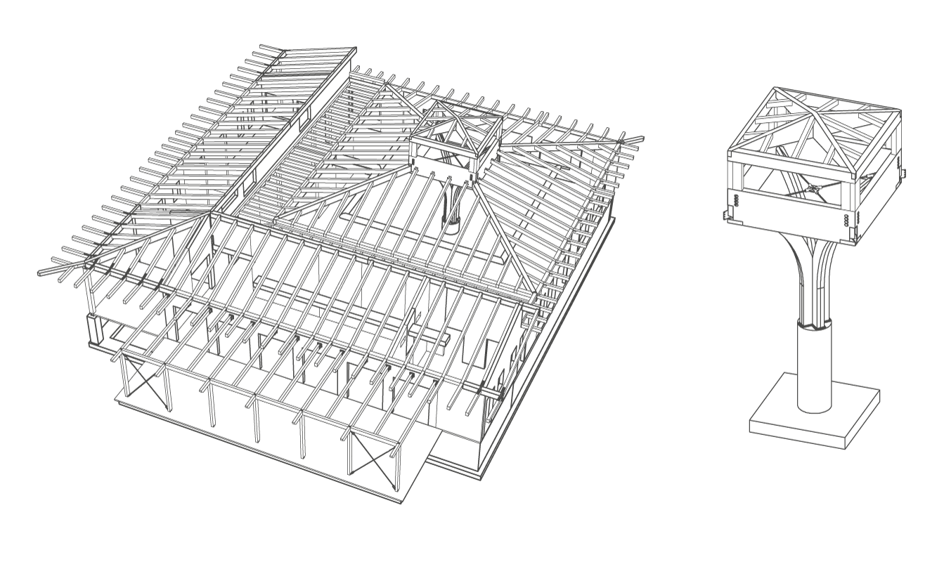 L’elemento caratterizzante è il pilastro centrale, formato da quattro travi curve strutturali che reggono tutta la copertura ed il lucernario. La loro particolarità è il raggio di curvatura di soli 3 m, che è stato realizzato impiegando solamente legname selezionato con spessori di soli 13 mm. Anche la copertura, di circa 800 mq, è stata costruita con struttura in legno in parte prefabbricata.