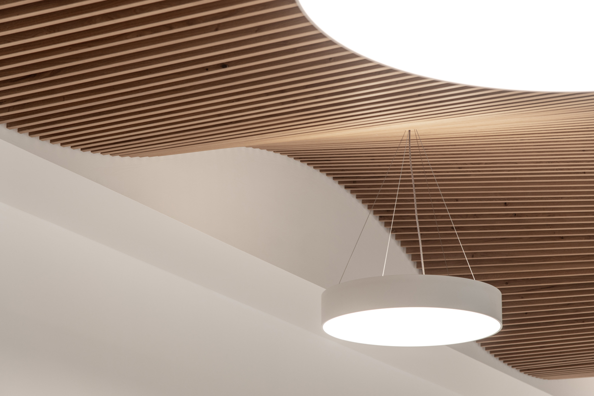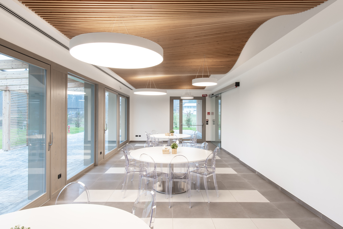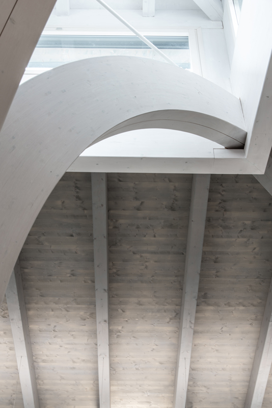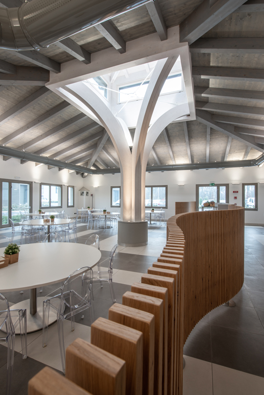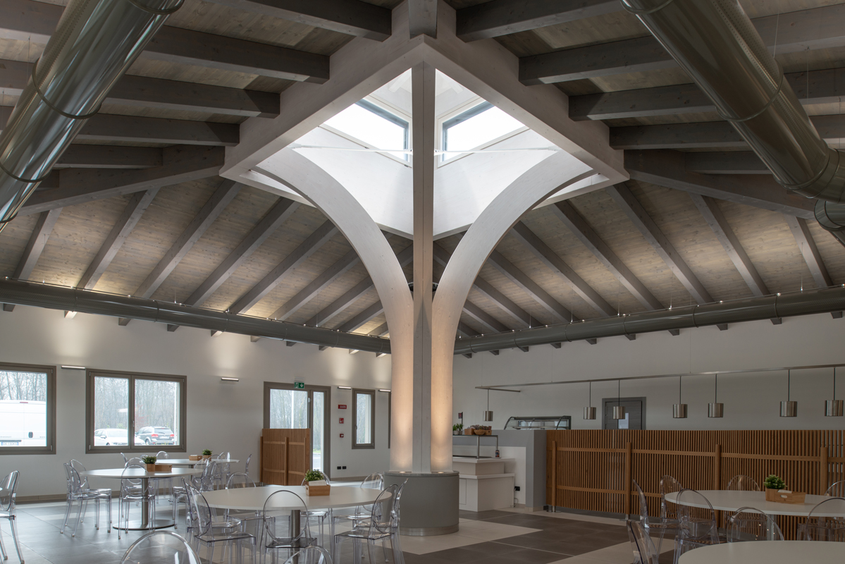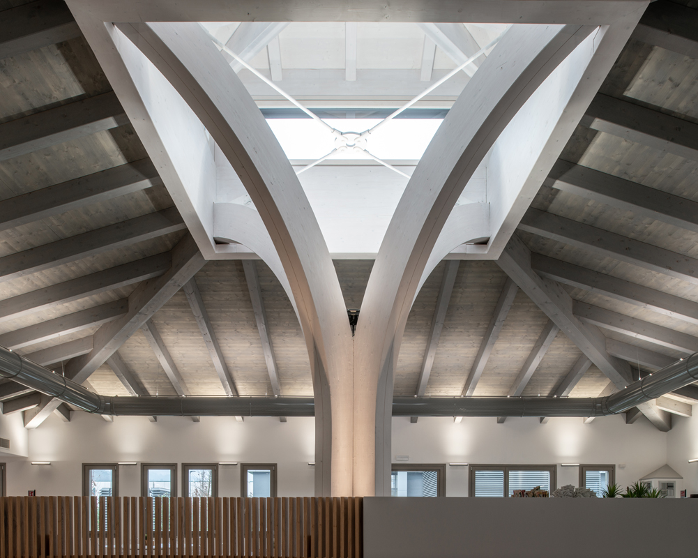 Il legno è protagonista anche nell’interno dell’edificio, particolarmente luminoso. Al centro della sala principale un pilastro in legno lamellare che richiama il tronco di un albero, si proietta verso l’alto, sorreggendo la copertura, anch’essa in legno, su cui si apre un lucernario che illumina in modo naturale l’ambiente. Il legno è trattato con una vernice che conferisce uno speciale effetto bianco naturale. Tutto intorno al corpo centrale corre una sorta di vestibolo che funge da spazio intermedio tra l’esterno e l’interno.