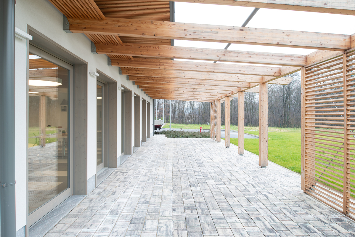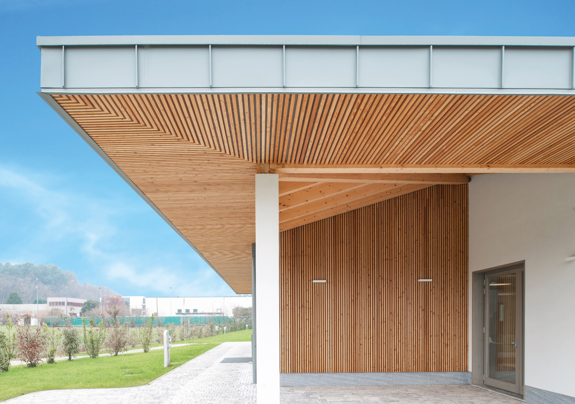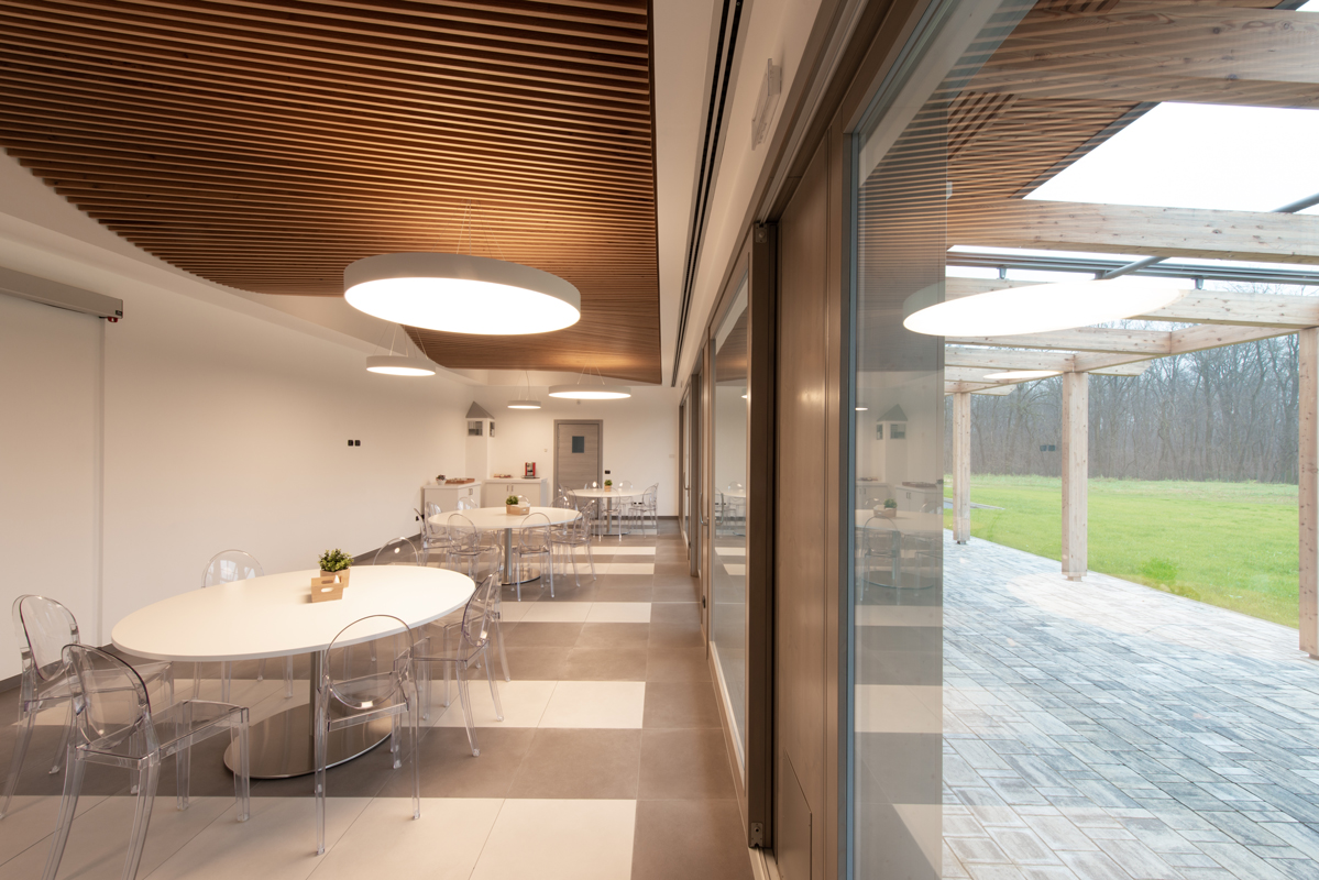 La nuova struttura che ospita i locali mensa di IWT, estremamente curata nei dettagli e nelle proporzioni, si sviluppa internamente su un solo piano, con ampie aperture vetrate che mettono in collegamento l’interno con l’esterno, stimolando un dialogo con il verde e la natura. Il dialogo è accentuato da un porticato, in parte coperto da un soffitto rivestito da travetti regolari in legno, in parte aperto e segnato dalla cadenza di pilastri e tralicci in legno.