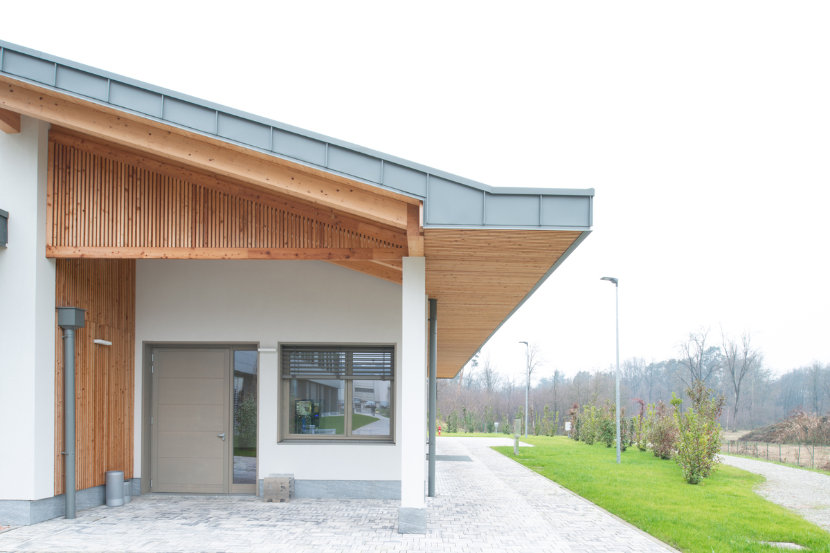 La struttura portante dell’edificio, interamente in legno, si sviluppa in pianta per 700 mq ed è stata realizzata utilizzando 500 mq di pannelli verticali intelaiati prefabbricati nello stabilimento Moretti Modular Contractor di Erbusco. I pannelli sono completi di struttura portante ed isolamento termico e definiscono la geometria completa della struttura completa anche di tutte le aperture.