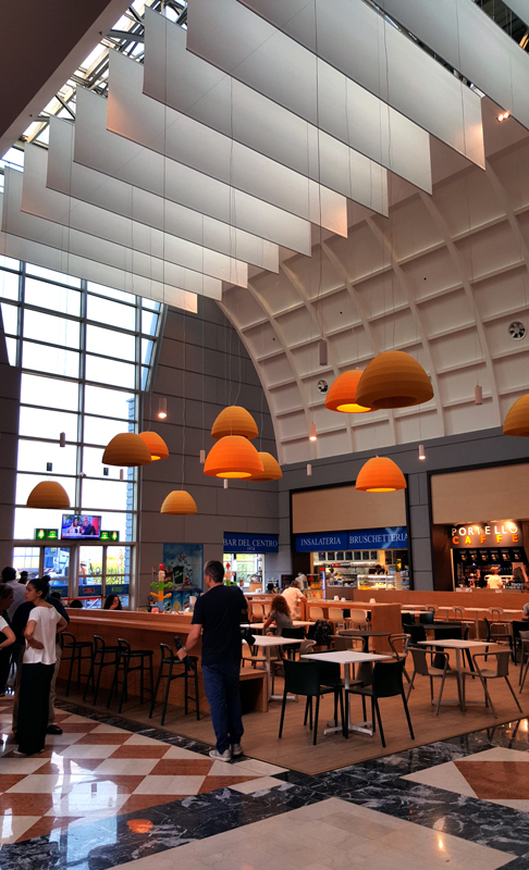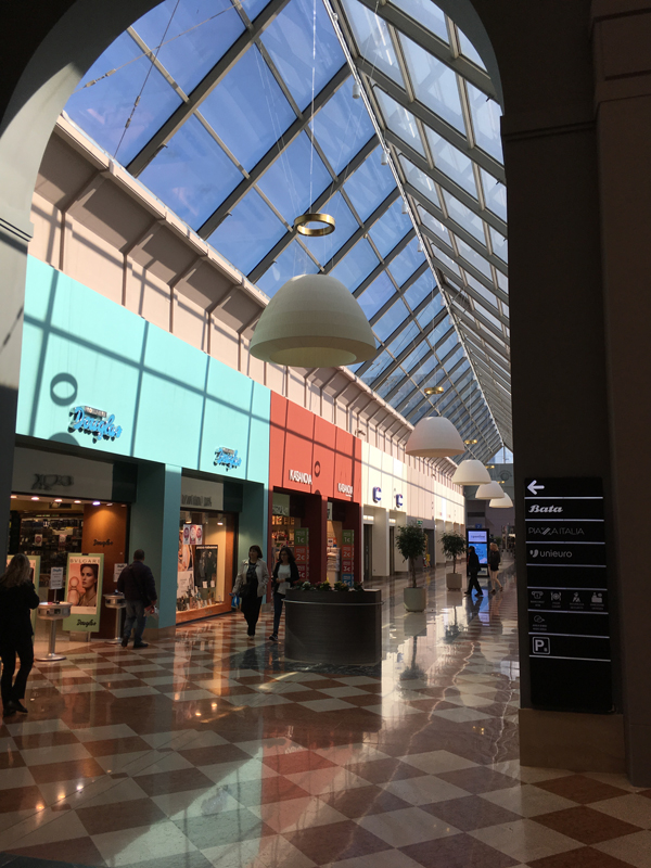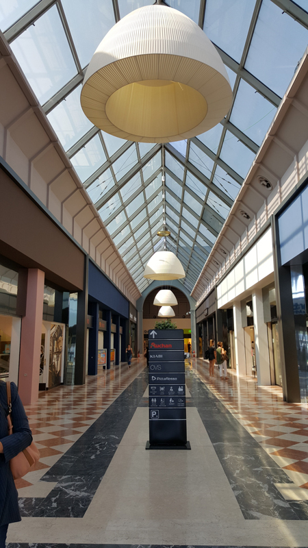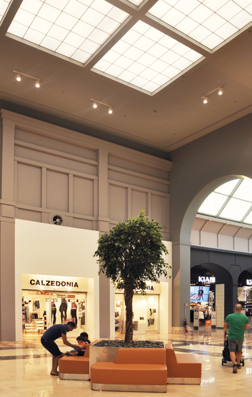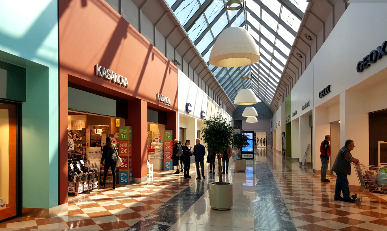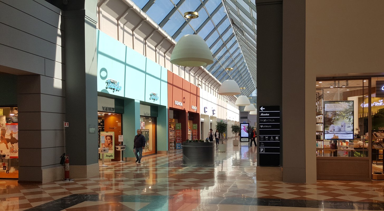 La ristrutturazione degli interni si è basata sul concetto di differenziazione delle diverse aree, creando dei mall diversi, che propongono differenti shopping experiences e favoriscono una maggiore vivibilità del Centro. Tutti i fronti delle 90 vetrine sono stati alzati ed è stata data maggior visibilità alle insegne dei brand; per i rivestimenti delle pareti sono inoltre stati utilizzati materiali tecnici quali marmo, acciaio e vetro retro-verniciato. Le volte dei mall e delle gallerie sono state ridisegnate creando una luce più diffusa attraverso l’inserimento di lamelle frangisole. Il legno è il protagonista della food court, animata da giochi di luce e proiezioni luminose sulle pareti.