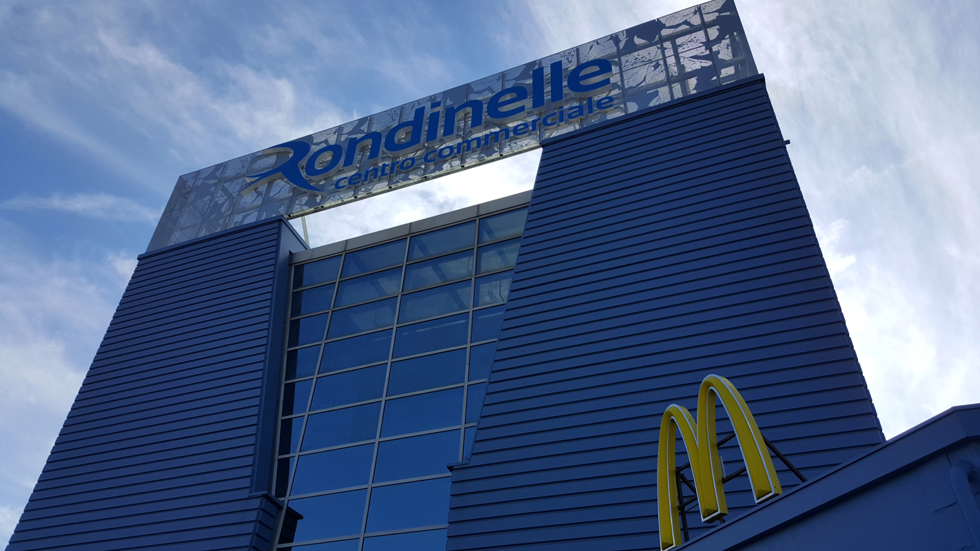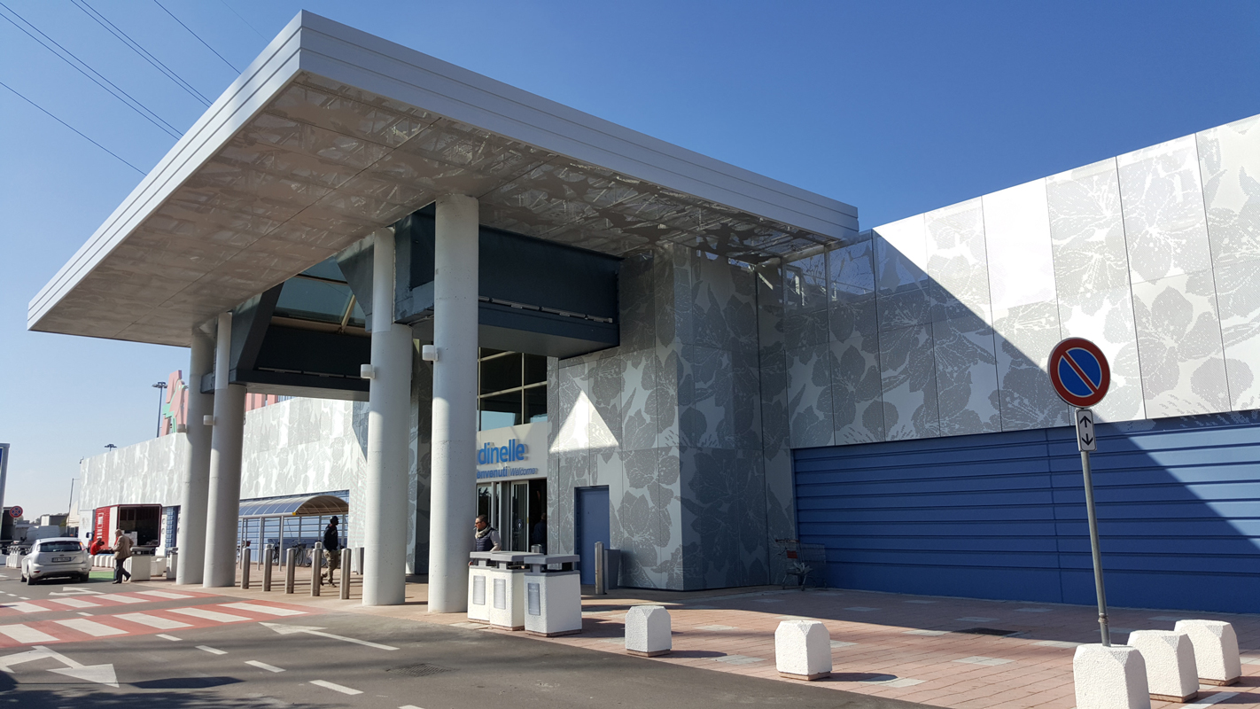 In particolare all’esterno si è utilizzato un alto fascione di rivestimento in lamiera microforata con effetto pattern a disegno floreale, sono state sostituite le facciate con un vetro più trasparente a tutt’altezza, sono state inserite in prossimità degli ingressi aree a verde verticale e pensiline con copertura in policarbonato alveolare e controsoffitto in lamiera forata, sono stati inseriti led-wall di grande impatto scenico.
