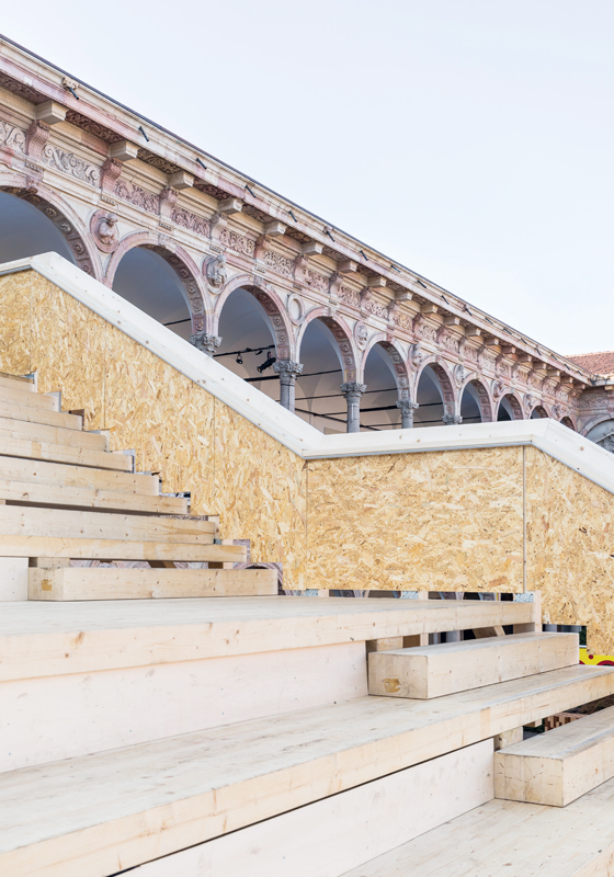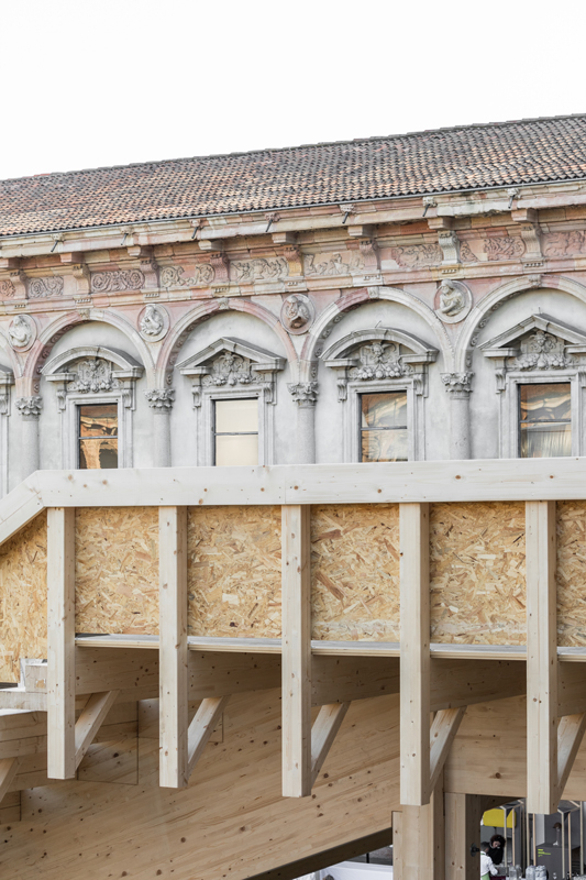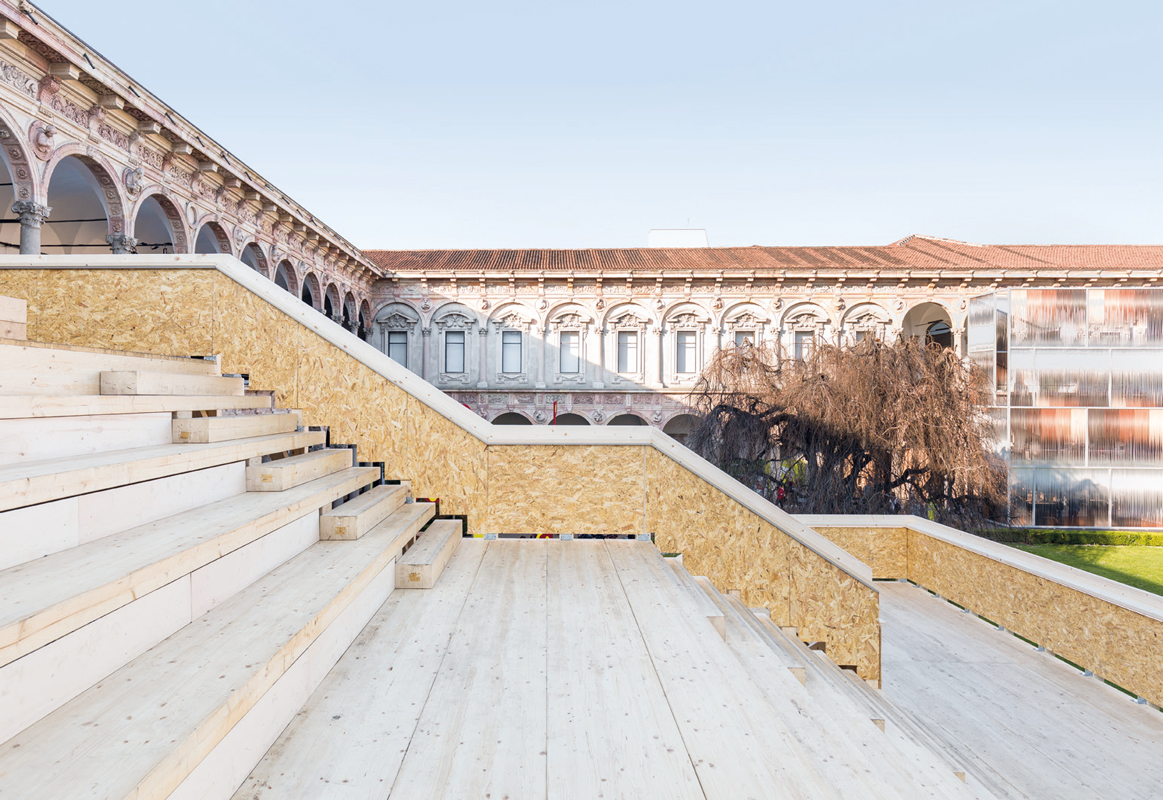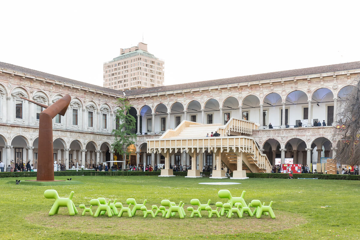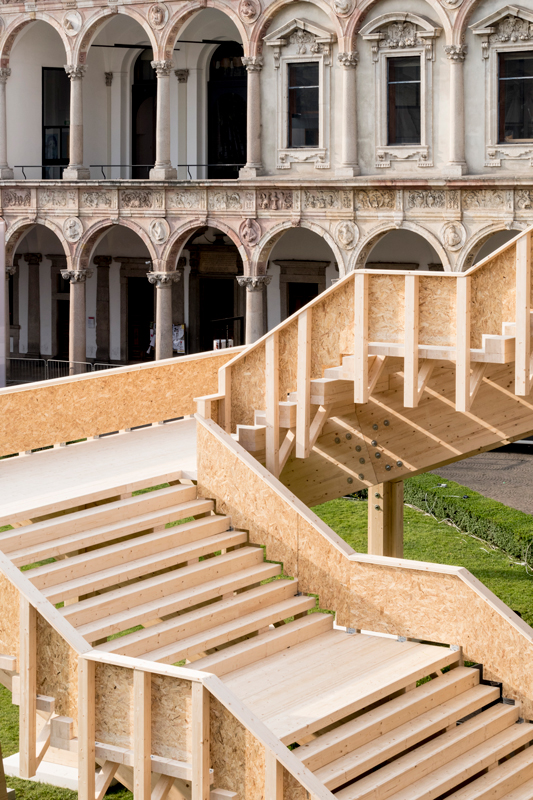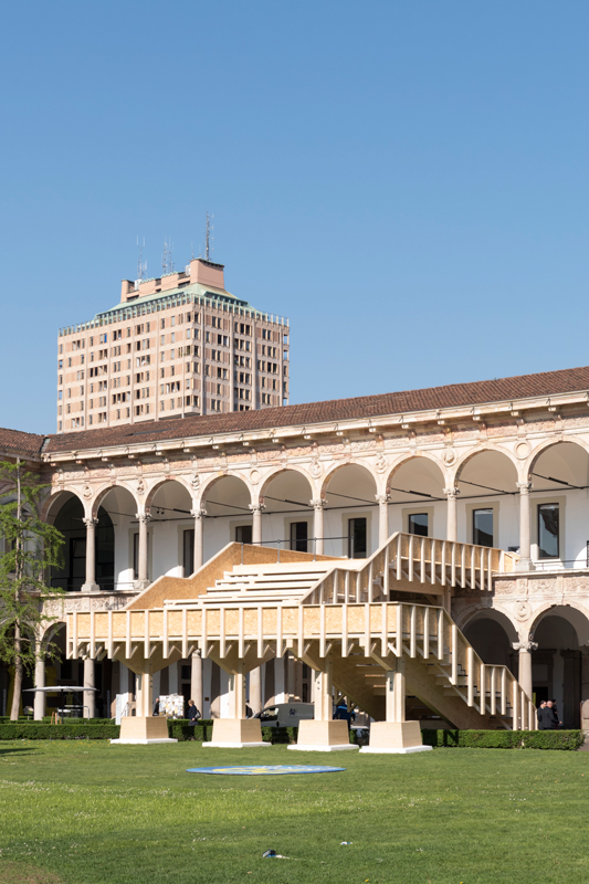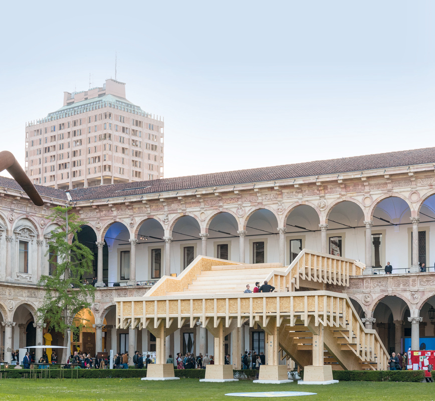 Un imponente scalone di legno per collegare il Cortile d’Onore con il Loggiato Ovest del chiostro della Ca’ Granda, mettendone in evidenza le straordinarie proporzioni. Questa l’installazione realizzata da Moretti Modular Contractor, su progetto di Michele De Lucchi, per Ferragamo Parfums alla mostra Interni Material Immaterial 2017. La concretezza funzionale e la materialità del legno di recupero del nuovo scalone sono state giustapposte all’immaterialità delle regole classiche dell’architettura storica, che cercano di definire i concetti di armonia e bellezza e trovano una grandiosa espressione nella magnificenza del cortile dell’attuale sede dell’Università degli Studi di Milano.