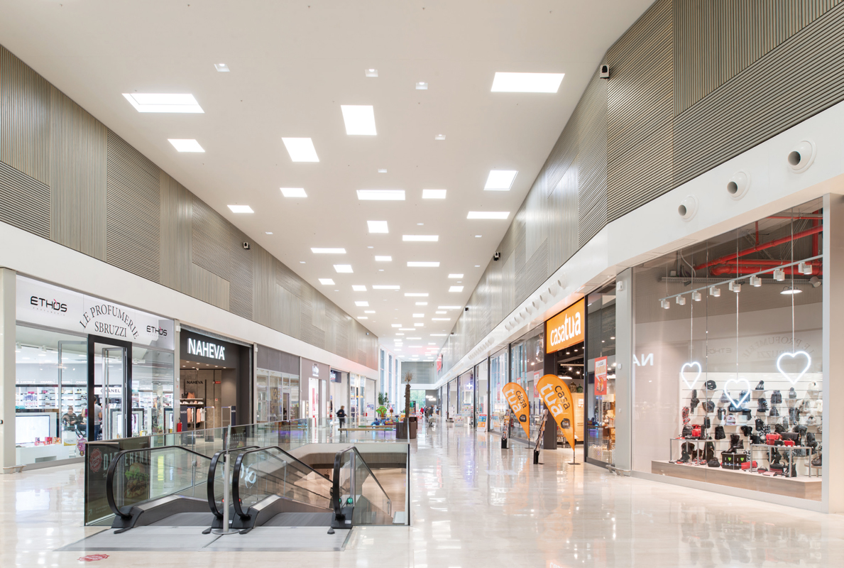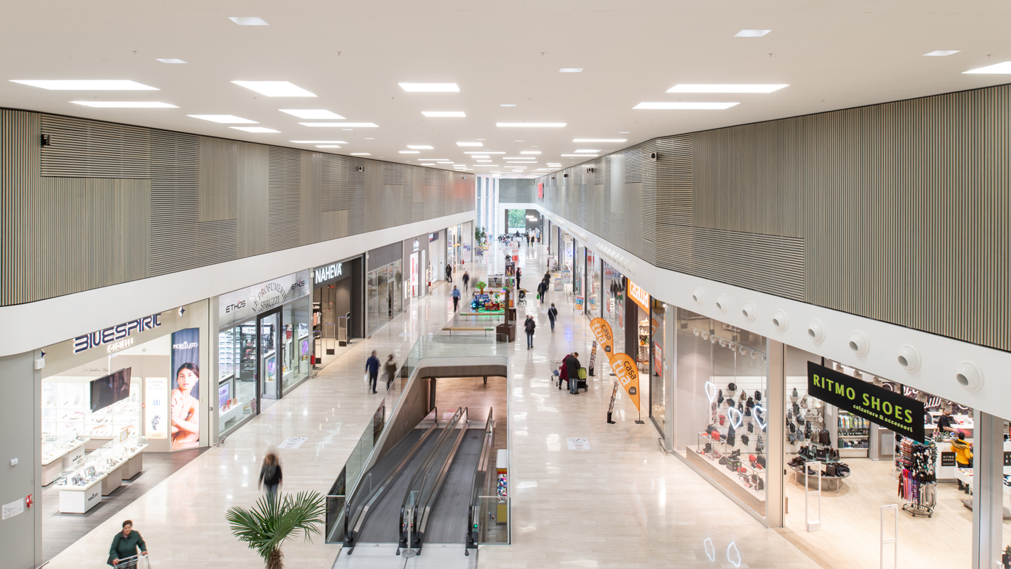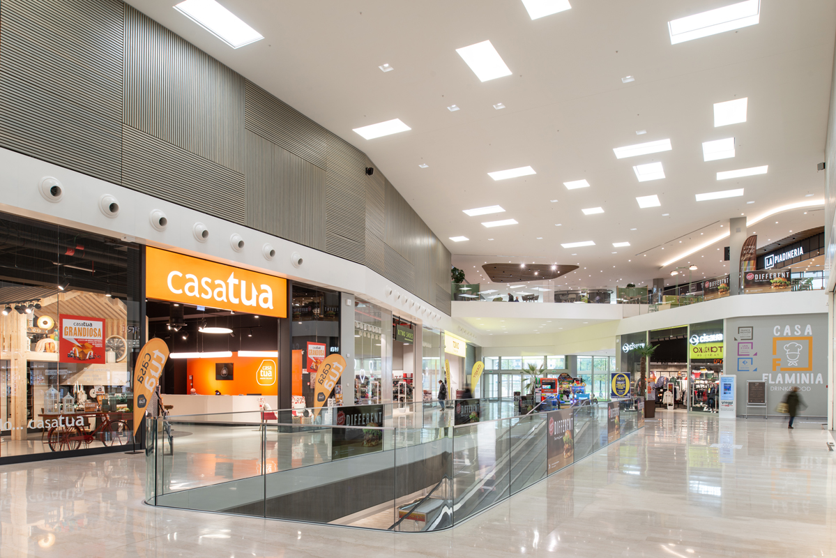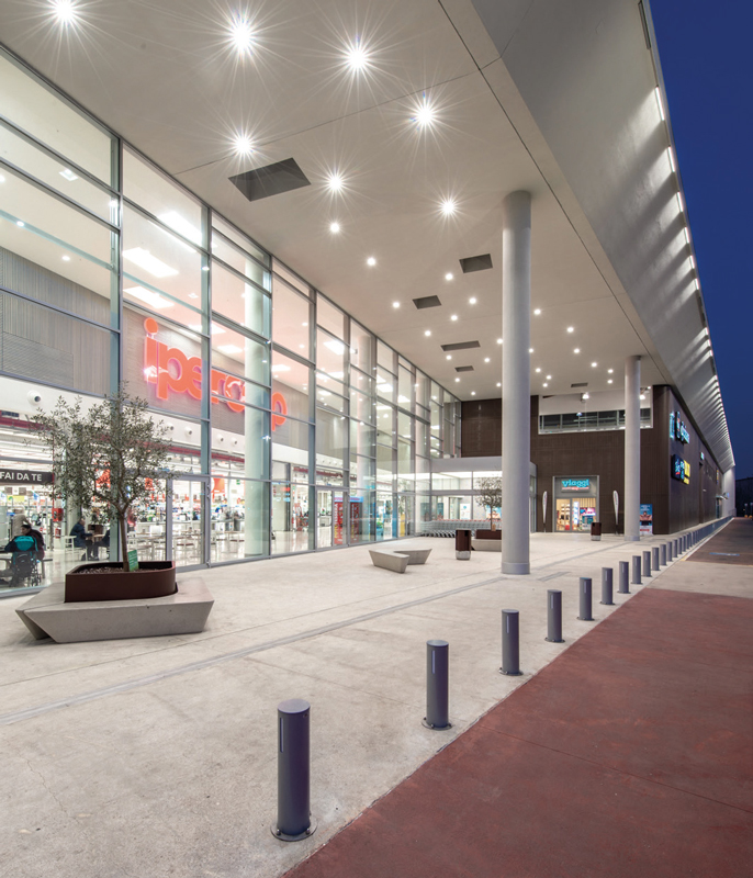 Il piano terra dell’edificio è occupato da un ipermercato da 6.200 mq specializzato e da altri 3.600 mq dedicate a tre medie superfici commerciali; sempre al piano terra è inoltre collocata una galleria commerciale passante di 1.450 mq su cui si affaccia una dozzina di piccoli negozi, mentre al primo piano è collocata un’area food di 1.000 mq, uffici e altre attività direzionali, oltre a una vasta terrazza (aperta al pubblico) che si affaccia direttamente sul parco.