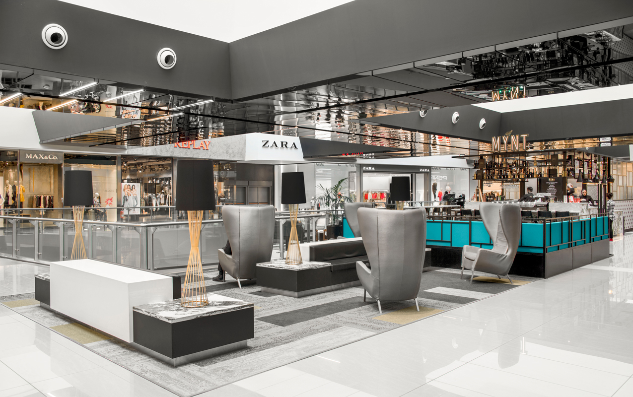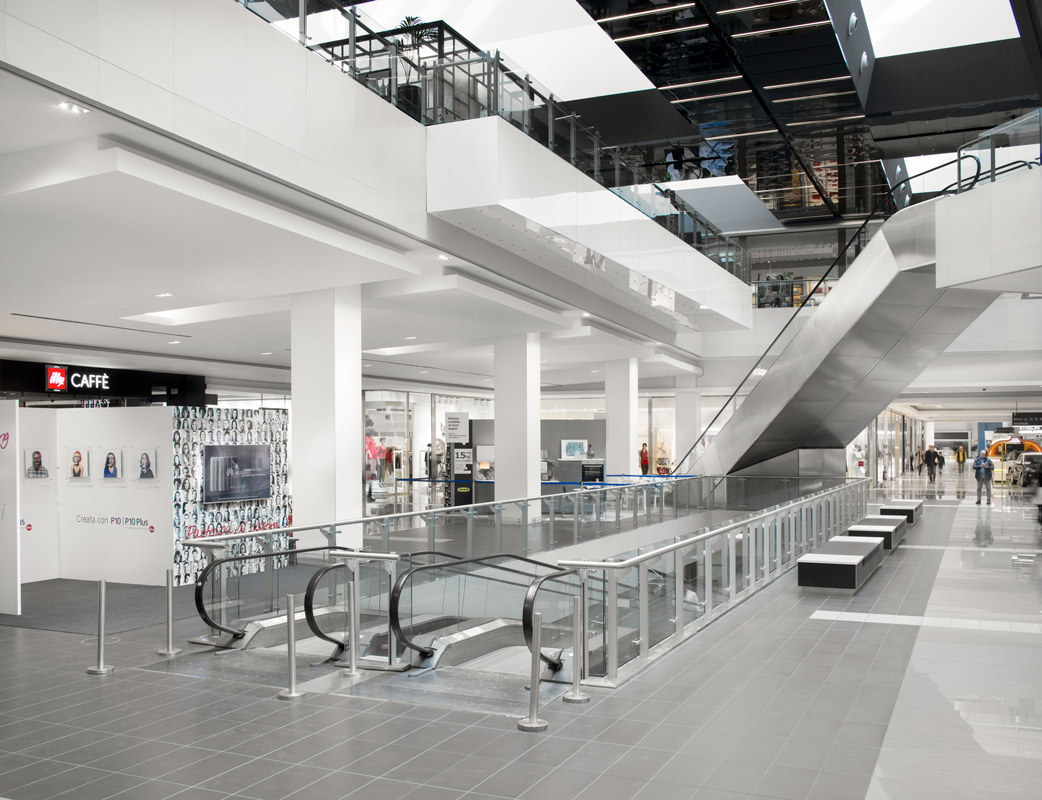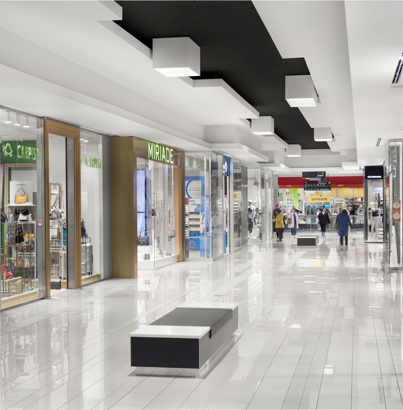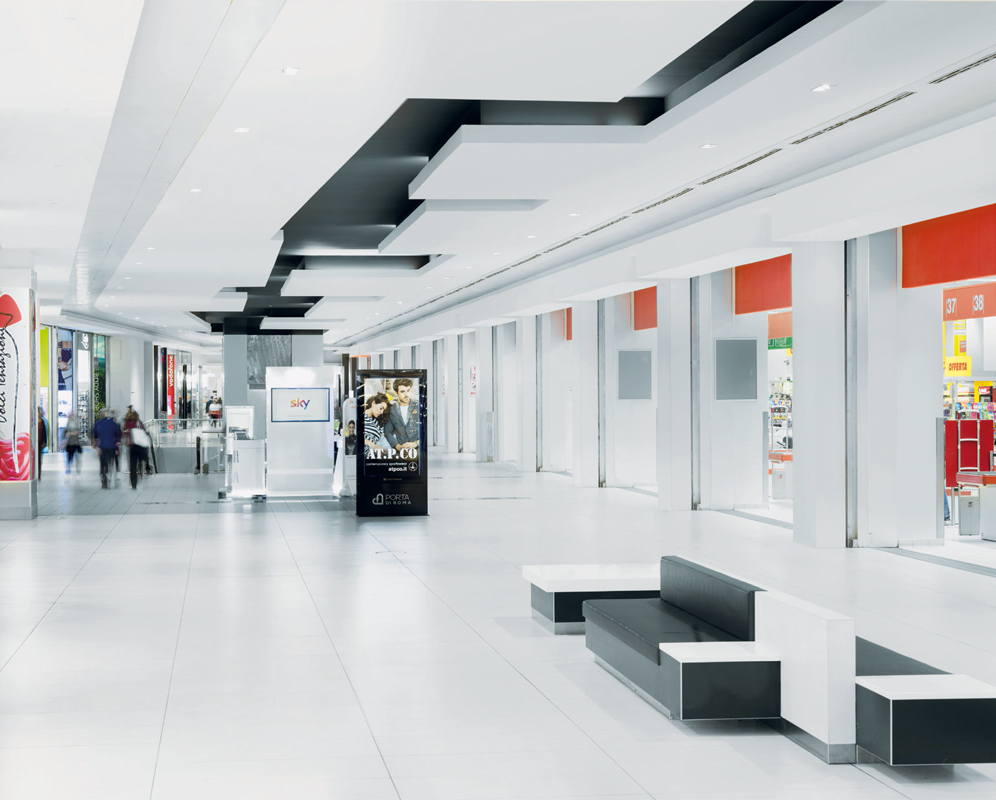 Tre sono stati i principali aspetti sui quali si è sviluppato l’intervento di refurbishing del Centro commerciale Porta di Roma. Un primo livello di intervento ha riguardato il completo rifacimento della pavimentazione della galleria sui due livelli con lastre di pavimentazione in gres e relativo massetto, previa demolizione di quella esistente ed eliminazione di tutti gli inserti colorati. Sempre nella galleria sono stati rimossi i controsoffitti esistenti, è stata modificata ed implementata l’intera impiantistica di servizio (idraulica, elettrica e antincendio) e sono stati posati nuovi controsoffitti. Un terzo aspetto dell’intervento ha riguardato infine le vetrine degli spazi commerciali della galleria, che sono state parzialmente arretrate e ampliate in altezza, inserendo un fascione metallico sopraporta e rivestendo le pareti con lastre di grande dimensione (1×3 m) in vetro retro-smaltato e Laminam.