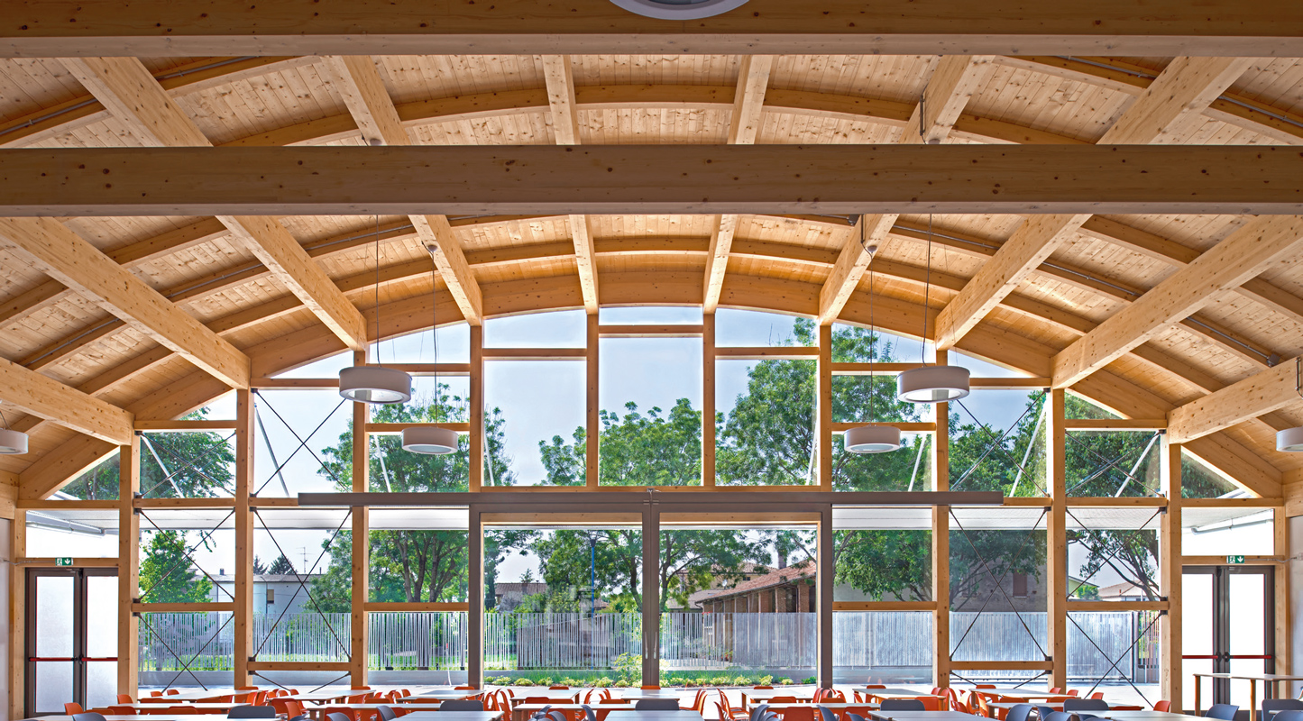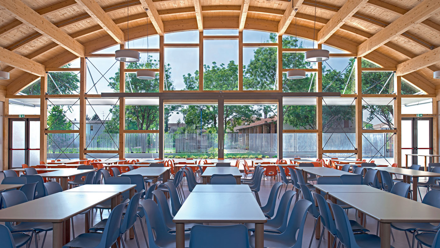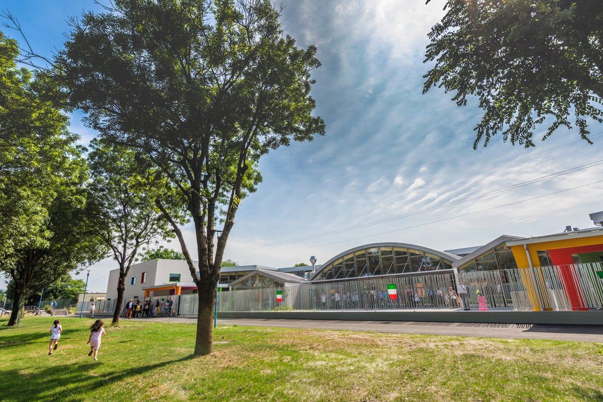 Il fronte del complesso, che si sviluppa su un unico livello ad eccezione dei due corpi posti simmetricamente agli estremi (palestra e abitazione del custode) disposti su due piani, è segnato da due pensiline in acciaio portante con copertura in lamiera grecata. L’intera struttura portante è in pannelli prefabbricati di legno lamellare a sandwich con ottime prestazioni acustiche ed energetiche e comportamento antisismico. I pannelli perimetrali sono controparetati con cartongesso a doppia lastra per mascherare gli impianti. I serramenti sono studiati per limitare le dispersioni, grazie anche all’impiego di vetri con alta resistenza passiva al suono, alta capacità termoisolante e ottima schermatura alla luce. L’impianto fotovoltaico, in copertura, può produrre fino a 80 Kw di energia elettrica, mentre l’illuminazione artificiale è interamente a led. L’acqua per i bagni, l’impianto antincendio e l’irrigazione è ricavata dalla vasca di accumulo delle acque piovane. L’intervento si completa con la recinzione perimetrale, la realizzazione di due aree gioco nel parco e il rinnovo dei sottofondi e del tappeto di finitura della pista pedonale e ciclabile antistante l’entrata.