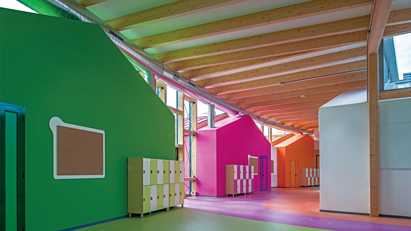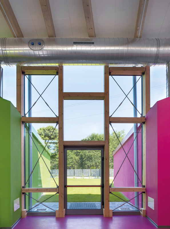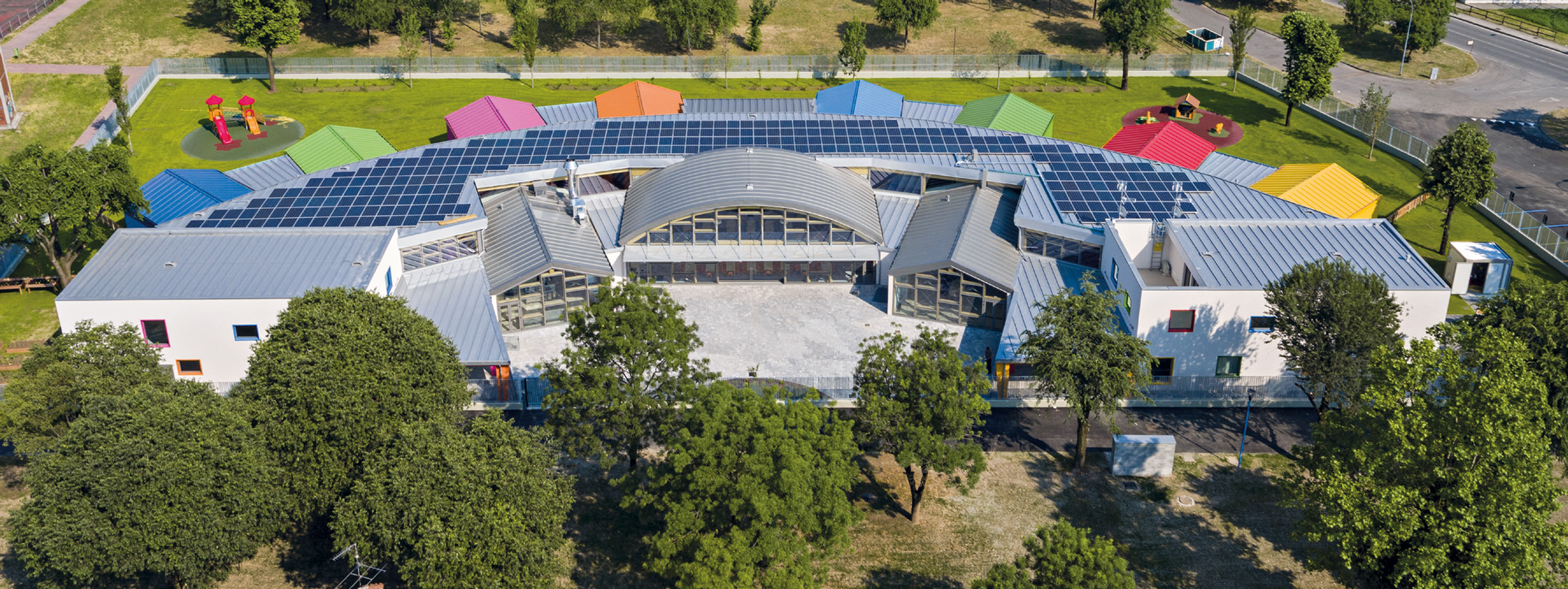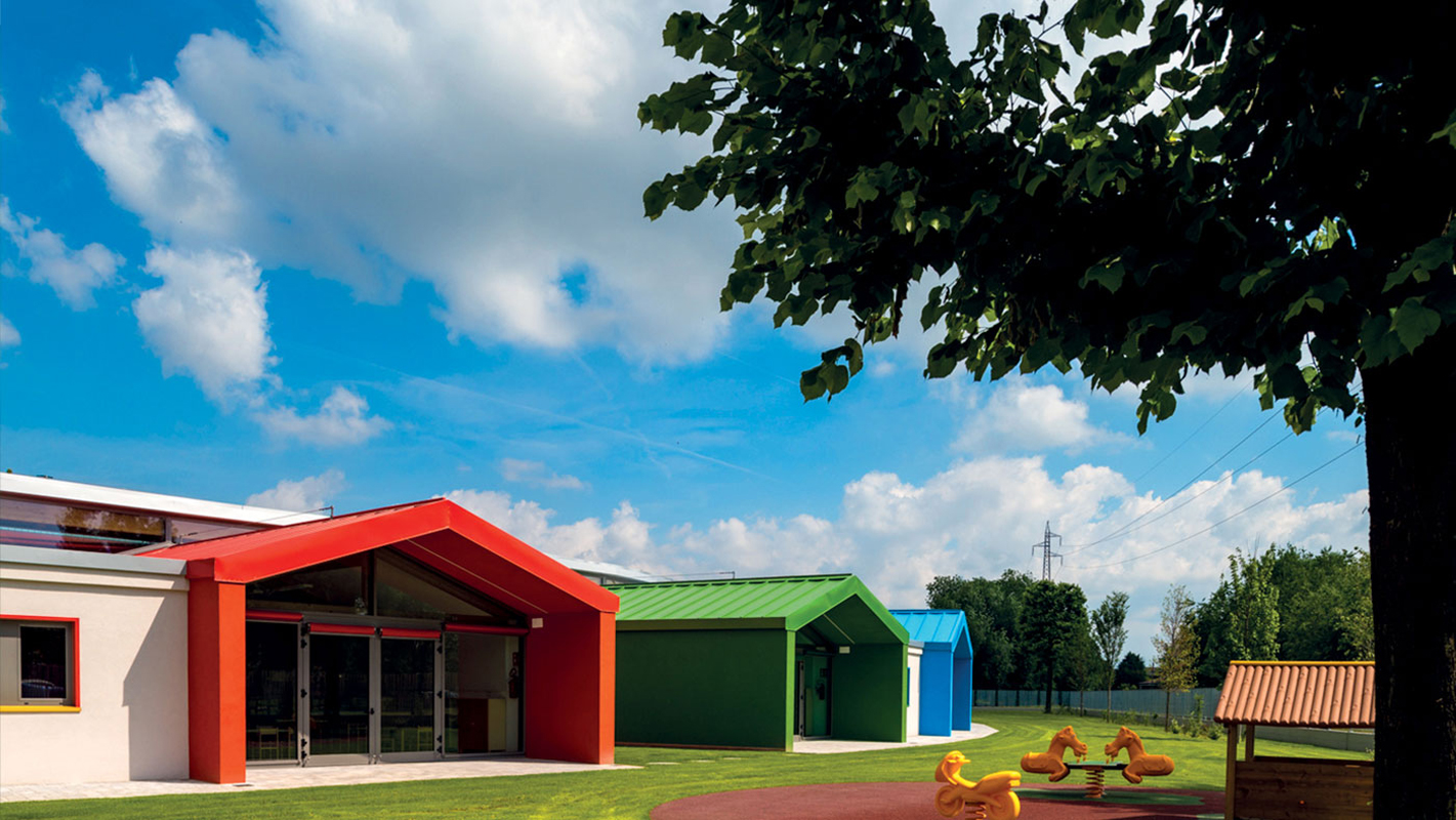 Immersa in un’ampia area a verde, progettata alla luce anche di avanzati studi psico-pedagogici, si apre a raggiera attorno ad un nucleo centrale modulare di 300 mq, che dialoga con un piazzale esterno di 500 mq grazie ad un sistema di serramenti scorrevoli, permettendo così di ottenere un’unica grande area da utilizzare per i momenti comuni. Attorno ad essa si sviluppano i corpi dei servizi comuni e otto aule indipendenti tra loro, ciascuna orientata per la migliore illuminazione solare naturale, contrassegnata da un colore e suddivisa in più aree funzionali (gioco, lavoro, riposo) e dotate di servizi.
