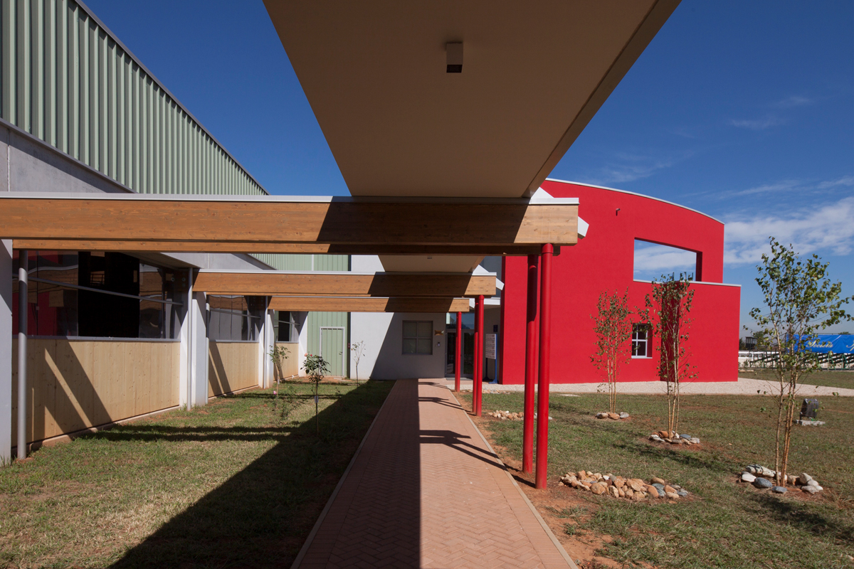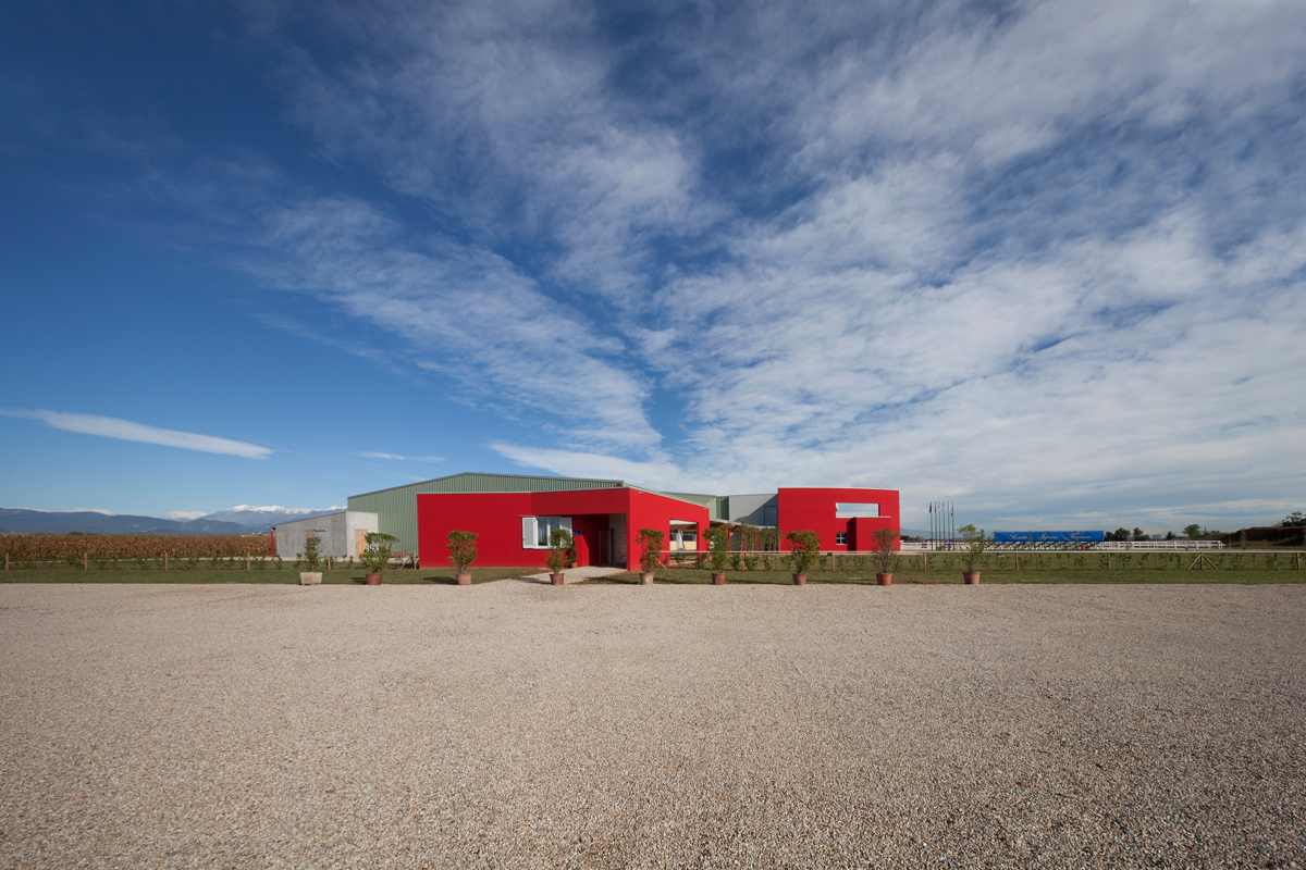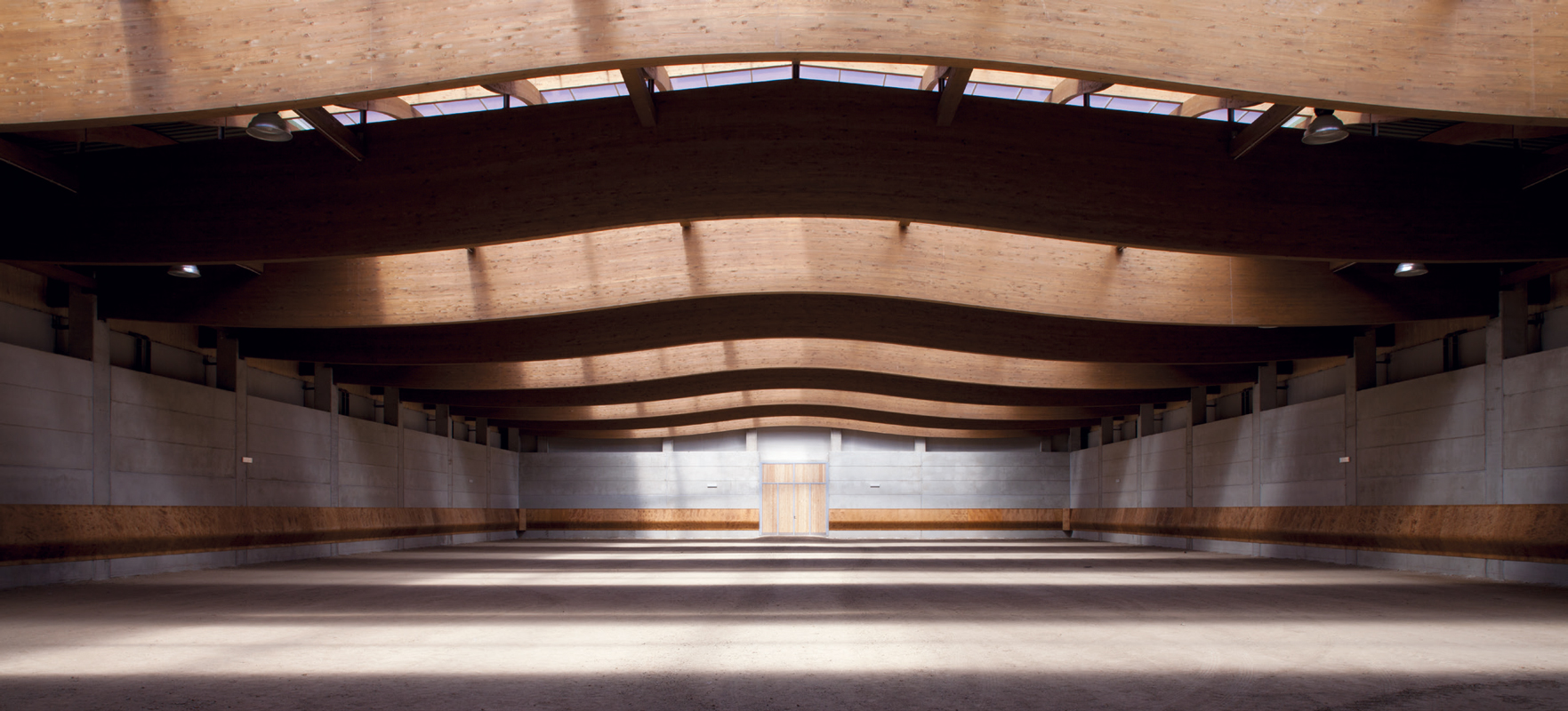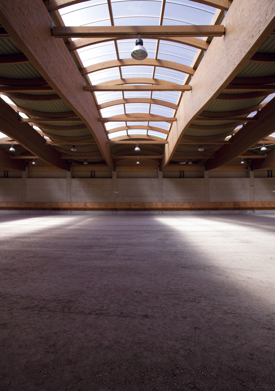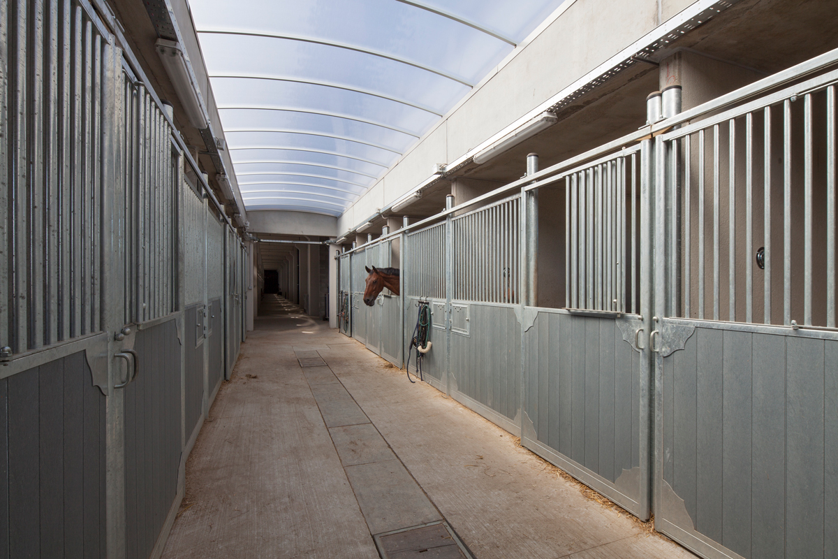 Il cuore del progetto sono le due arene interne, una dedicata ai pony ed una ai cavalli, separate da un ampio corridoio vetrato e interamente circondate, sul perimetro, da 100 box: la più grande si sviluppa su una superficie di 64×34 m, mentre l’altra su un’area di 26×34 m. L’intervento si completa con due arene esterne, una vasta zona di lavoro che ospita un deposito per i foraggi, la letamaia, una giostra e un tondino per gli esercizi, e la club house.